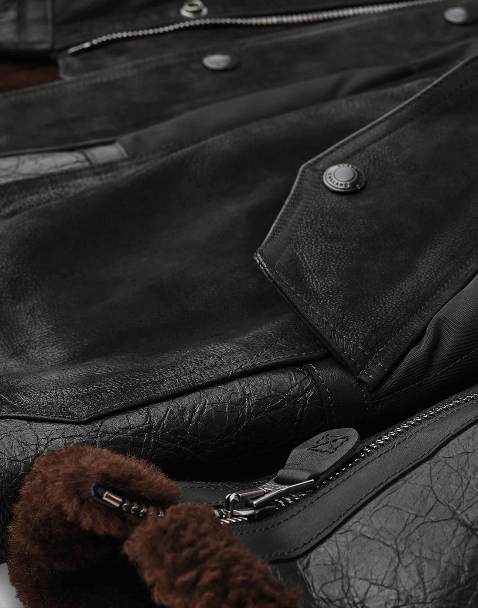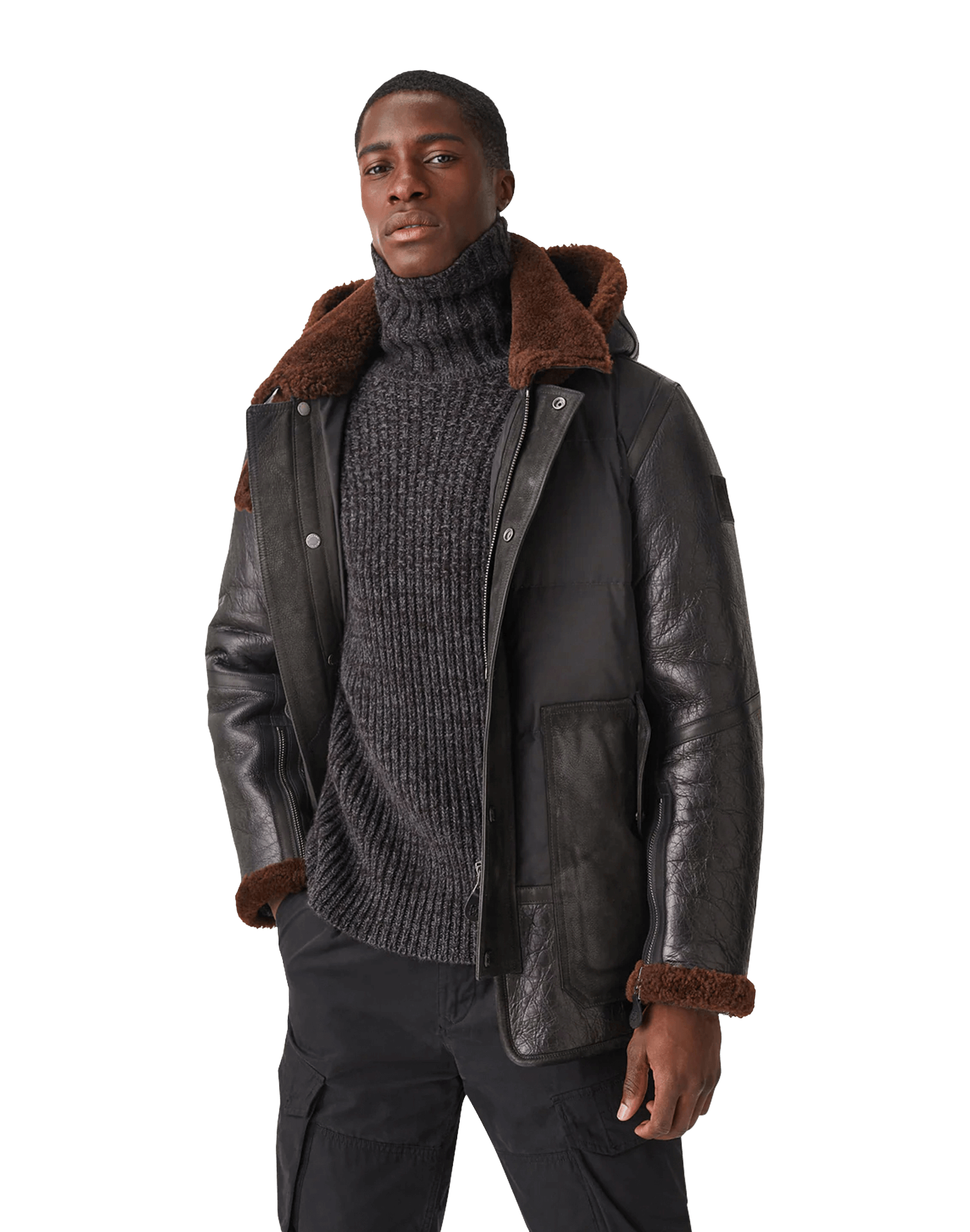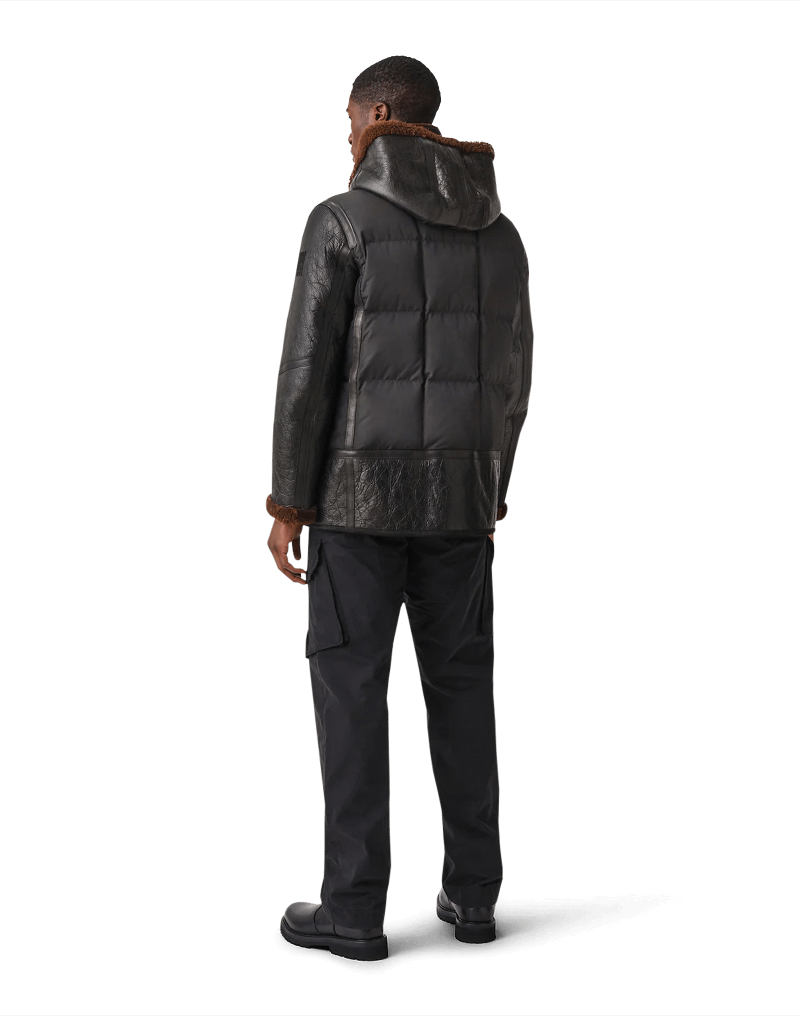 - Down-filled nylon body, shearling sleeves, collar and hood