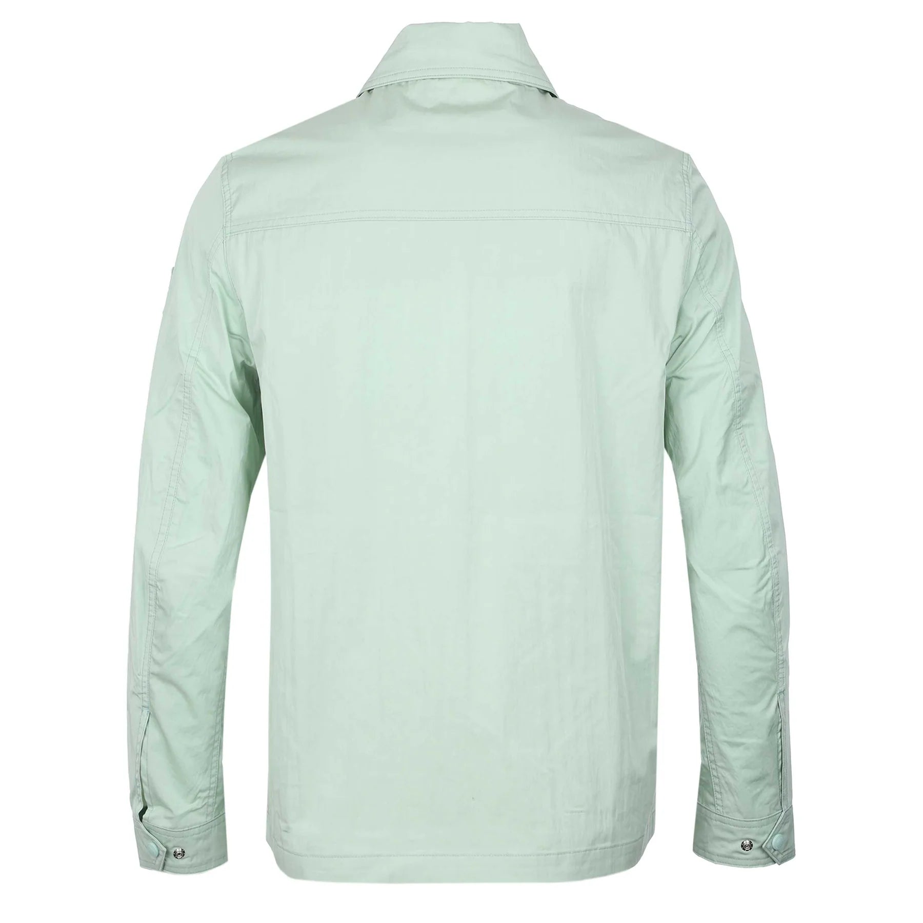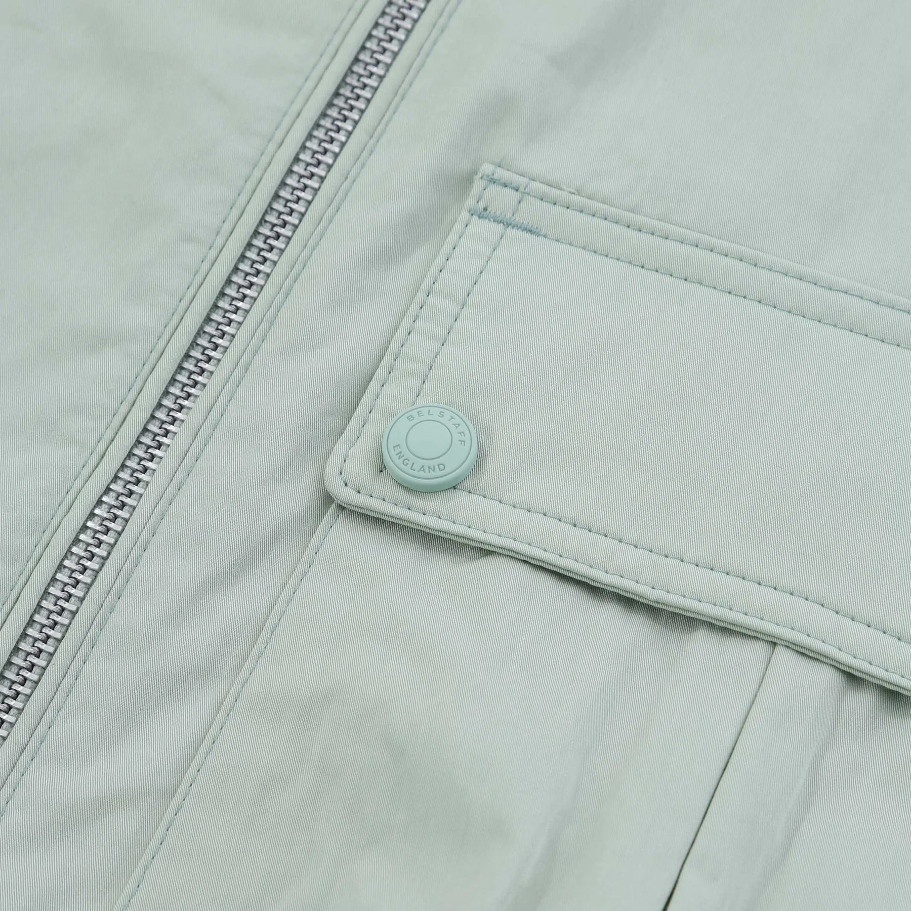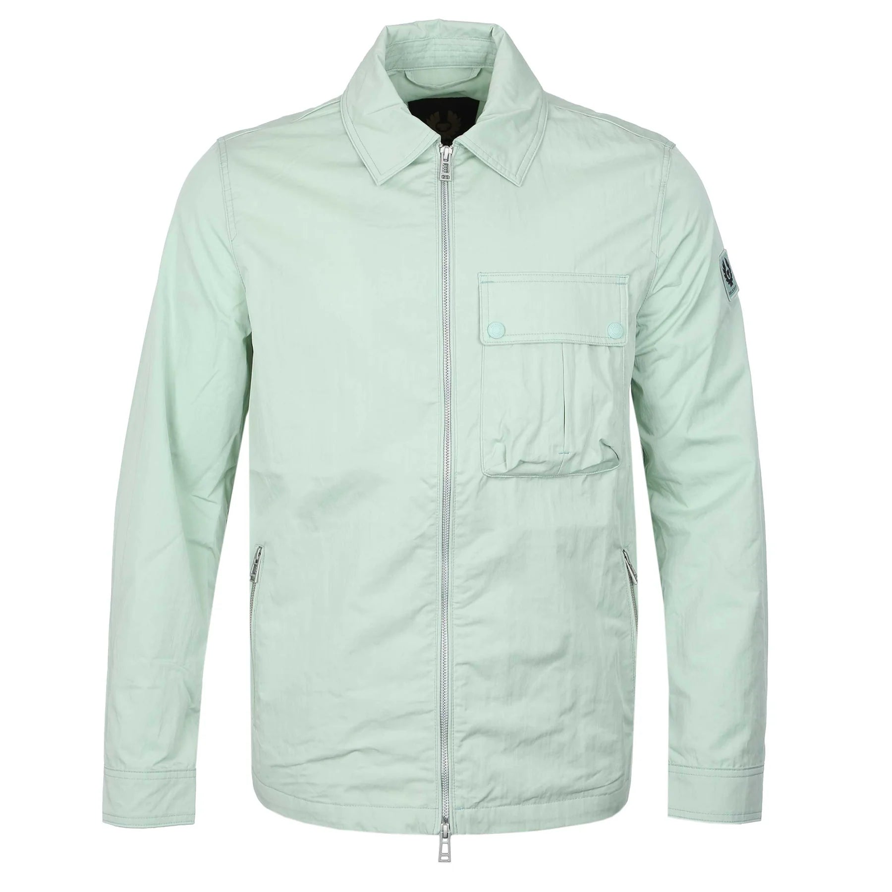 Belstaff Drome Overshirt in Breeze Green. A lightweight overshirt by Belstaff with a water repellent finish. A zip-up, collared style overshirt with a chest pocket with snap fastening. Featuring a full zip fastening and two zip fastening side pockets. Adjustable press stud cuffs. Finished with a Belstaff logo on the left sleeve.