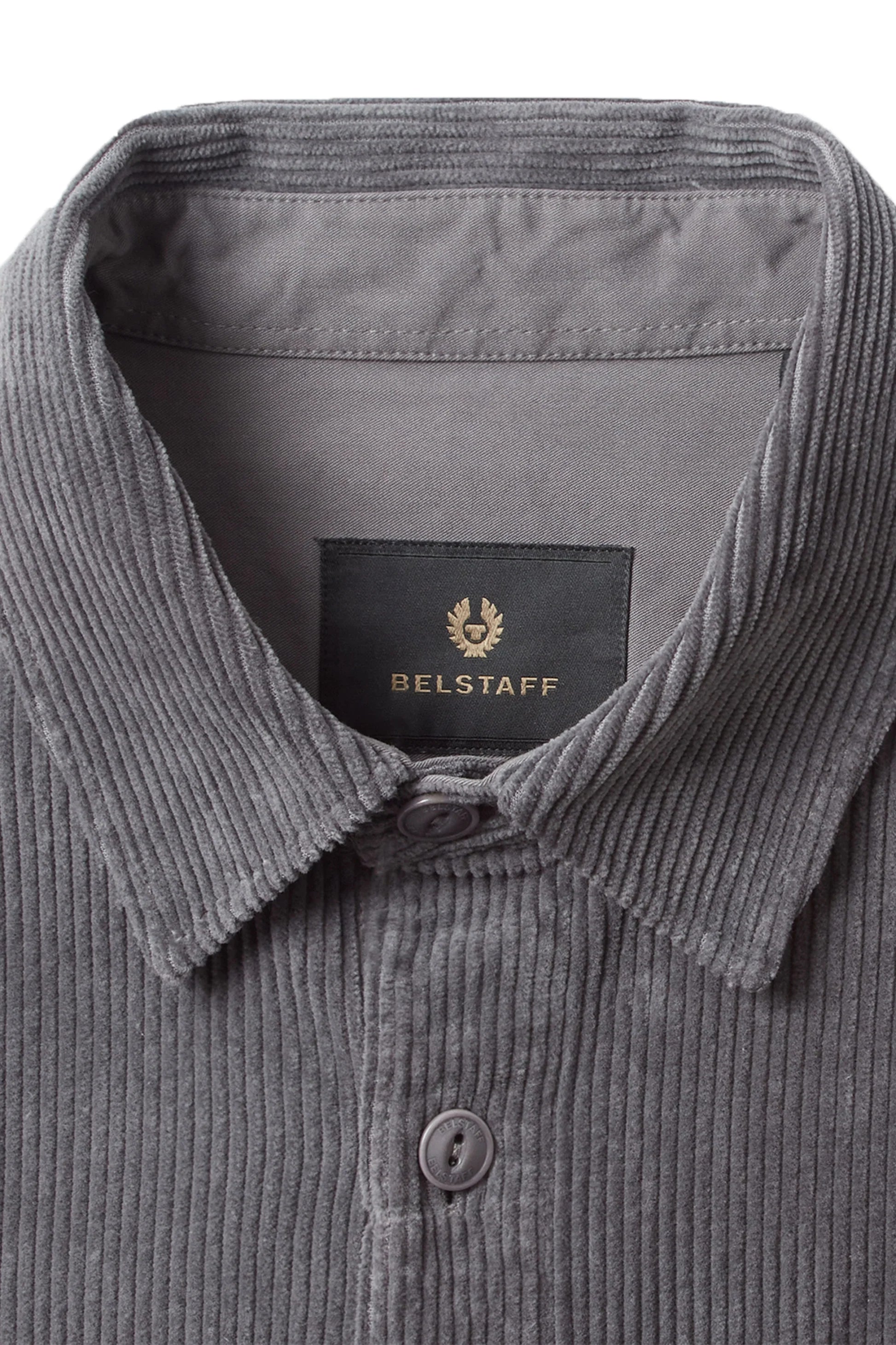 Belstaff Fallgate Shirt in Tornado Grey. A relaxed fit shirt by Belstaff. Crafted from a heavyweight corduroy, this shirt features a full button fastening placket and a two button fastening chest pockets. One of the chest pockets has a contrasting fabric design. Finished with the Belstaff logo on the left sleeve. Perfect shirt to layer up with a Belstaff t-shirt.