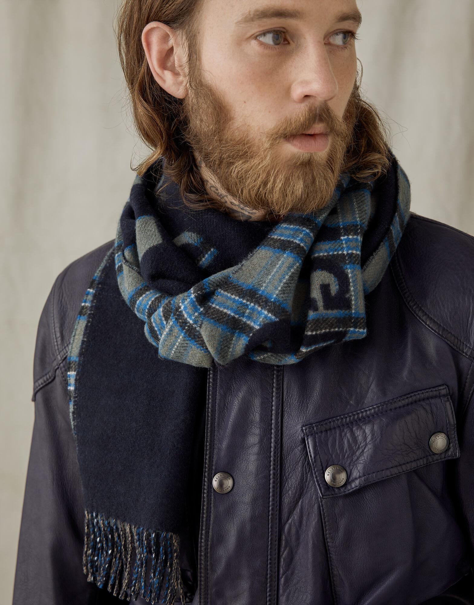 The Belstaff Signature Check Scarf, Constructed from 100% wool, finished with classic Blue and Navy Belstaff designs.