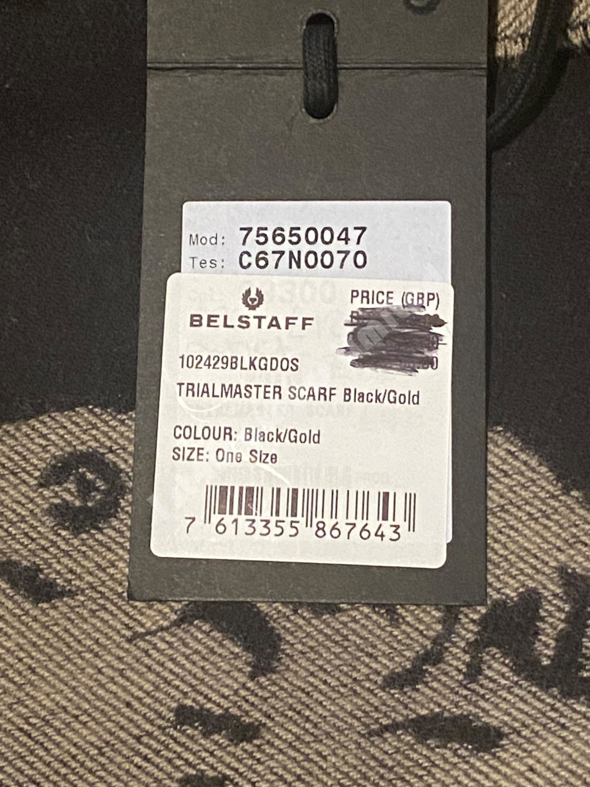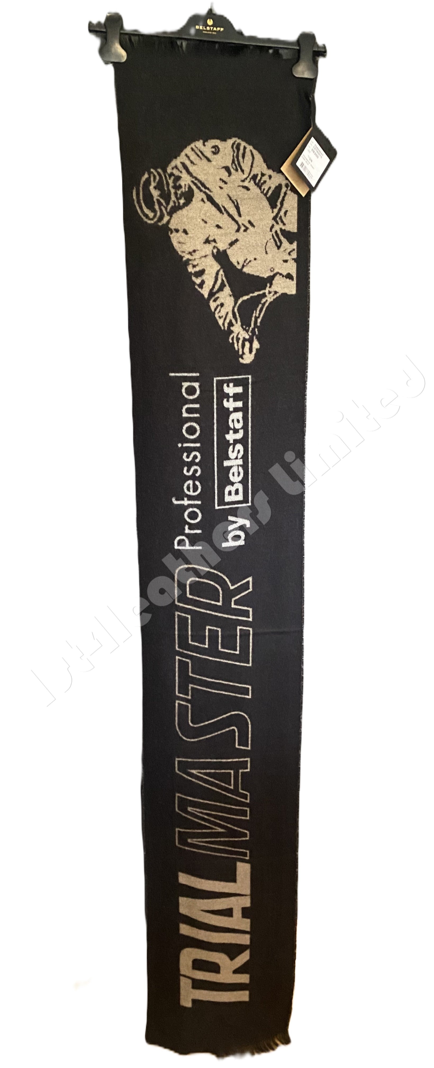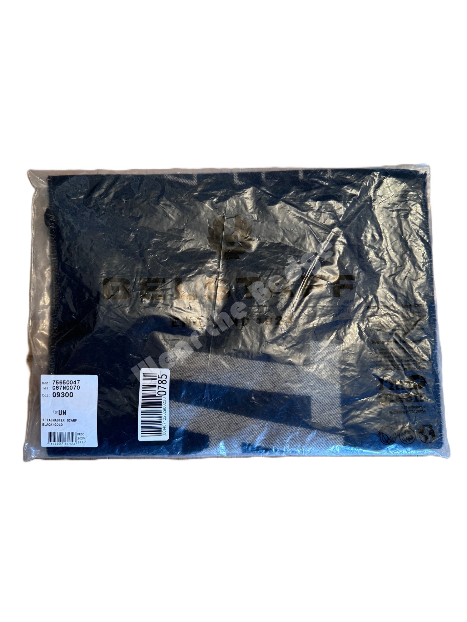The Belstaff Trialmaster Scarf, Constructed from 100% wool, finished with classic Black and Gold Belstaff designs.