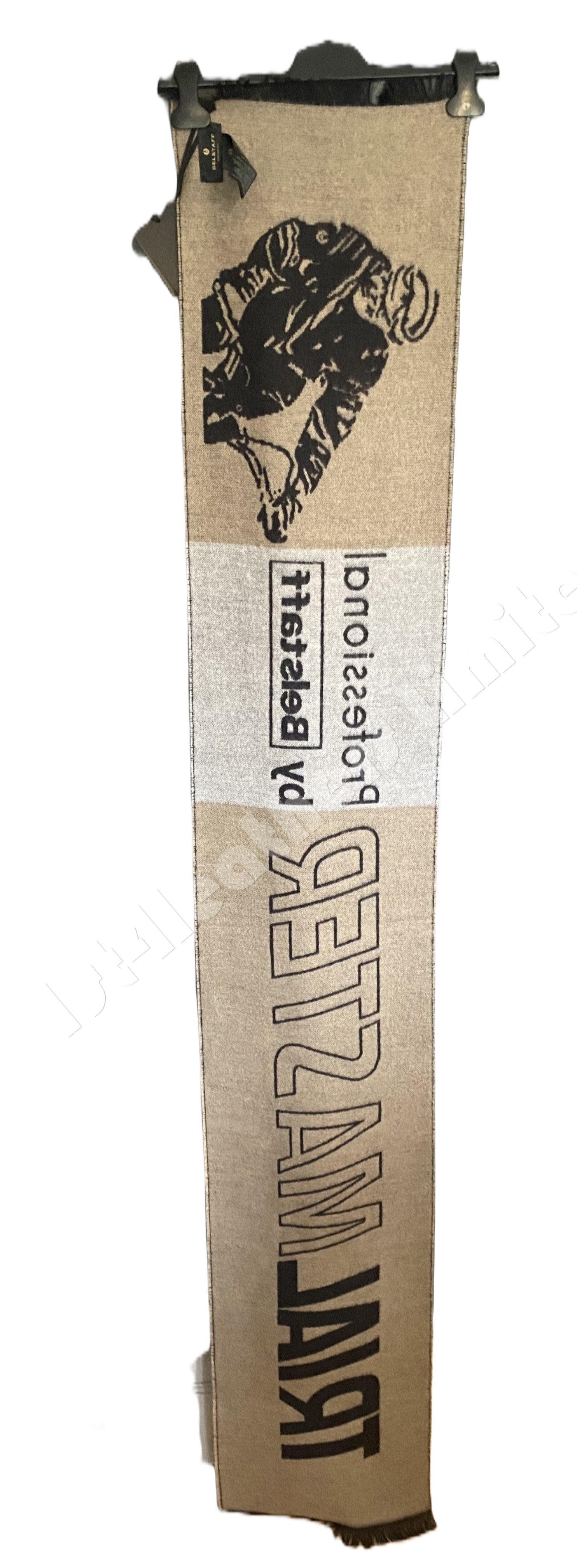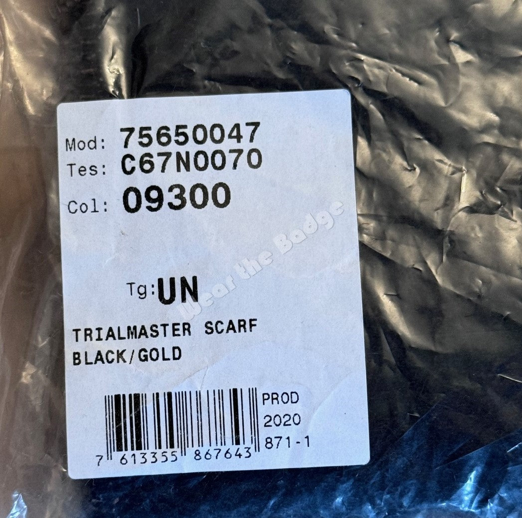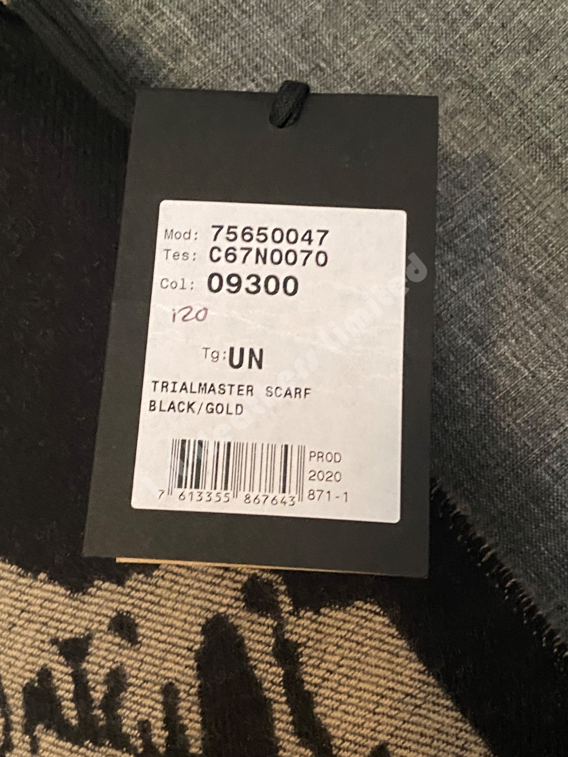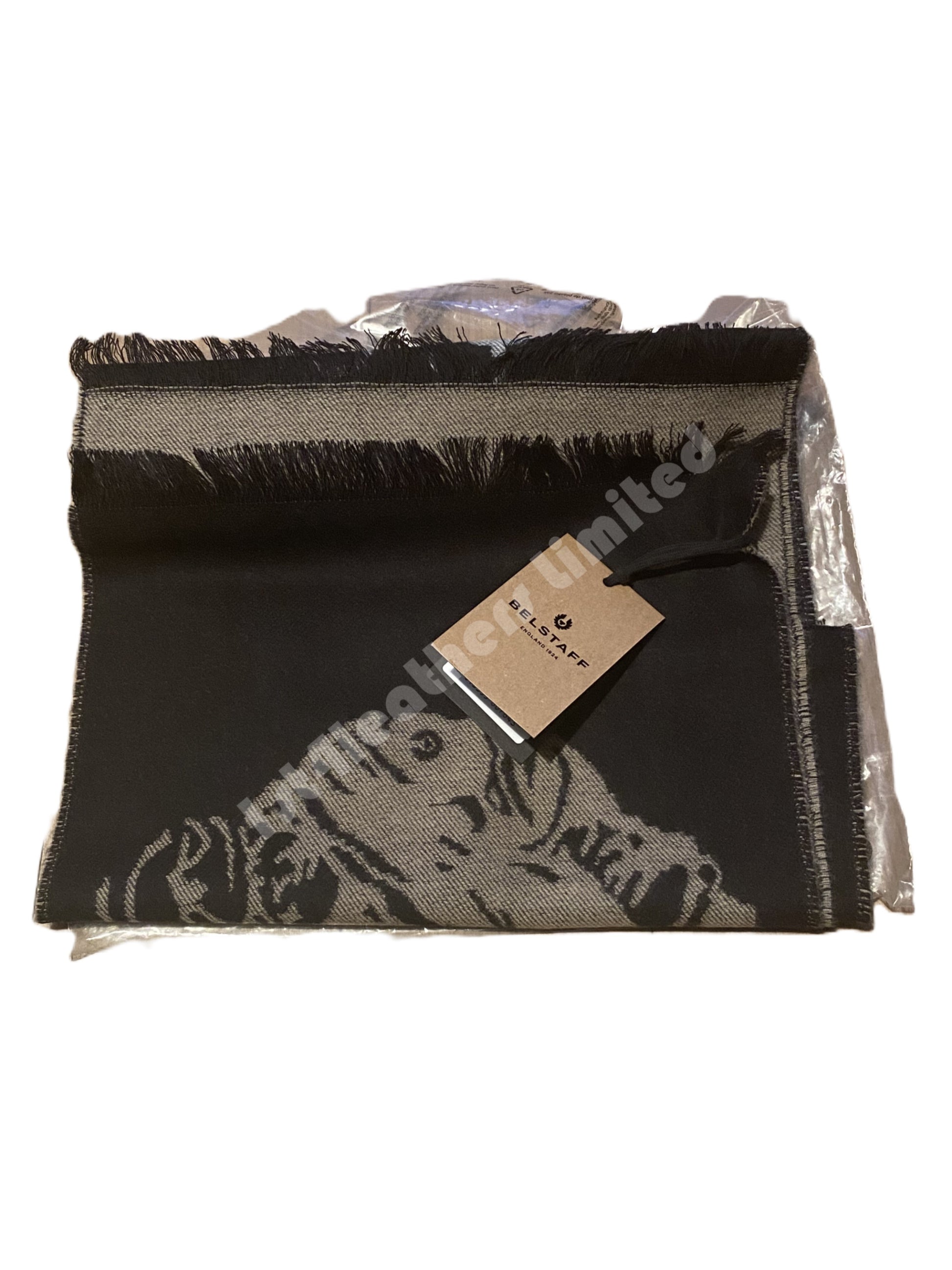 The Belstaff Trialmaster Scarf, Constructed from 100% wool, finished with classic Black and Gold Belstaff designs.