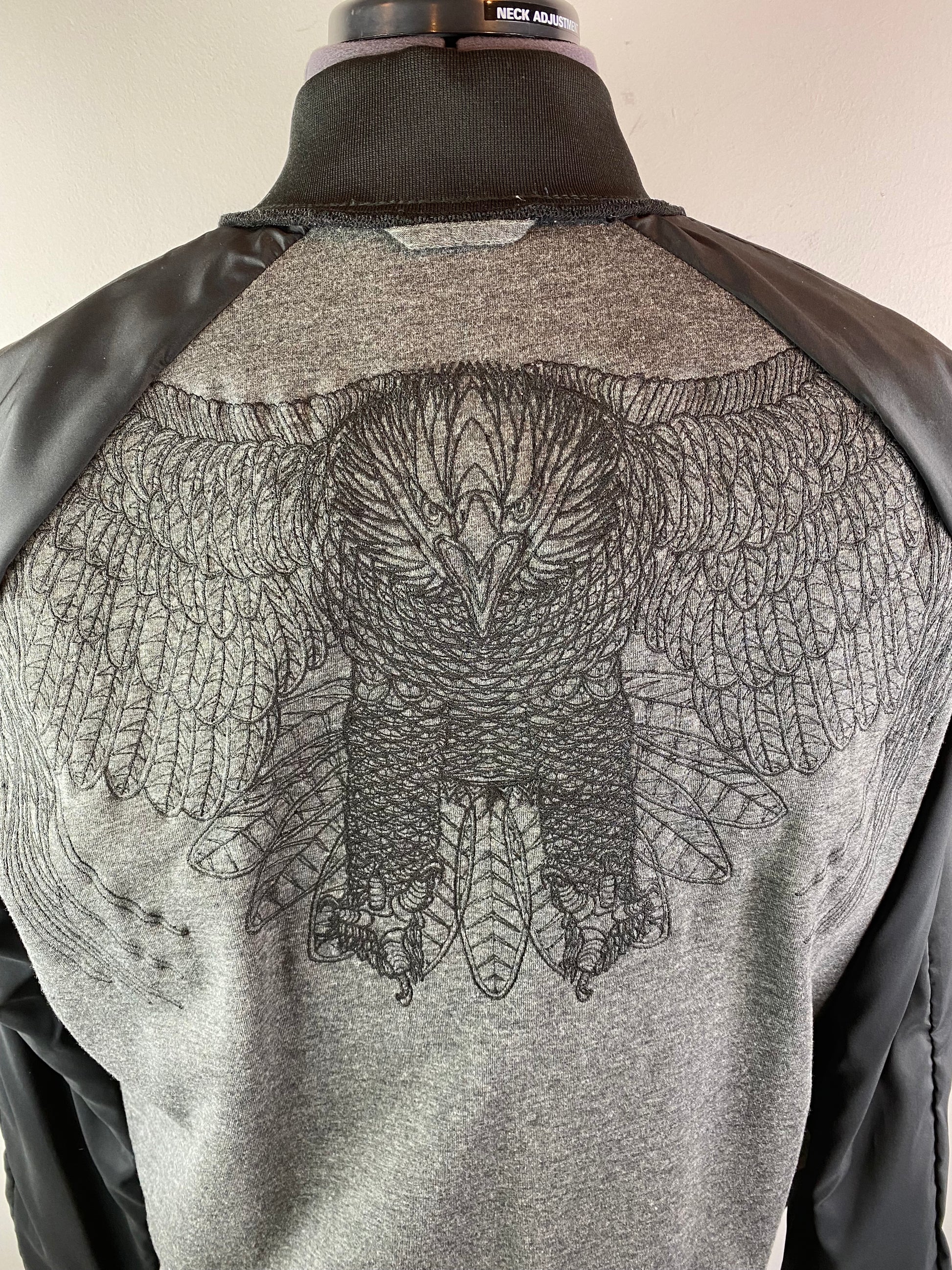 A timeless style, this Leather Sleeves and Denim Body Bomber jacket from Armani's 'Emporio Armani' range, oozes style and sophistication with a modern urban edge. Features full length double zip, cloth collar, waistband and cuffs, angled zip closing hand warmer pockets, large embroidered Eagle crest to back (shown more in detail on interior jacket photos), a button closing inside pocket and partially lined (Sleeves).