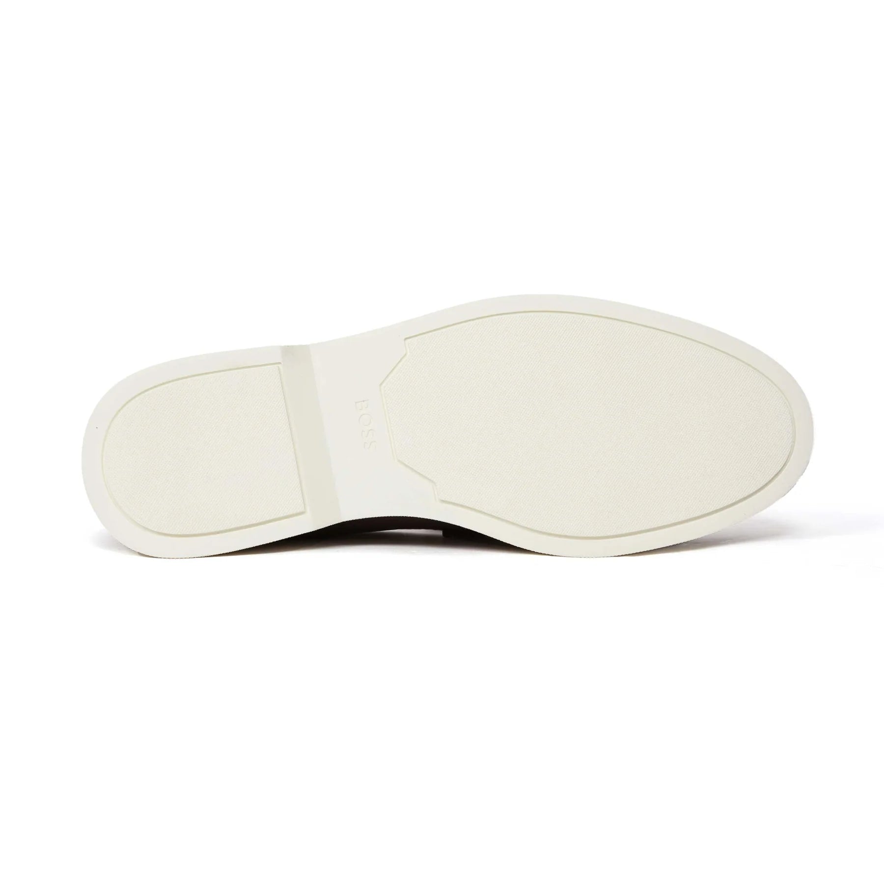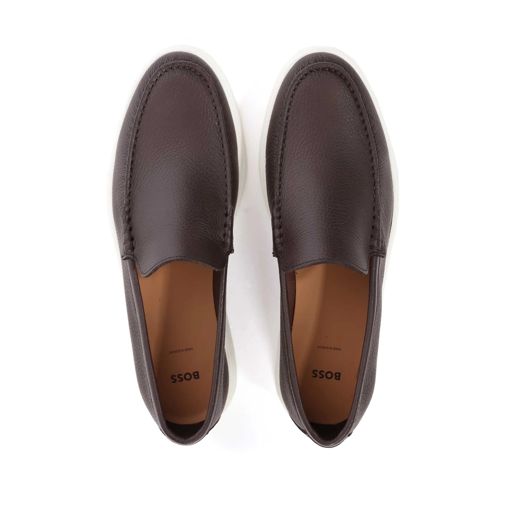 BOSS Sienne Moccasin Shoe in Brown. Slip on loafer style shoe by BOSS. Crafted from a textured soft leather with a rubber outsole. Featuring a contrasting colour sole. Embossed BOSS logo to the slip on entry. Perfect to wear with chinos or shorts.
