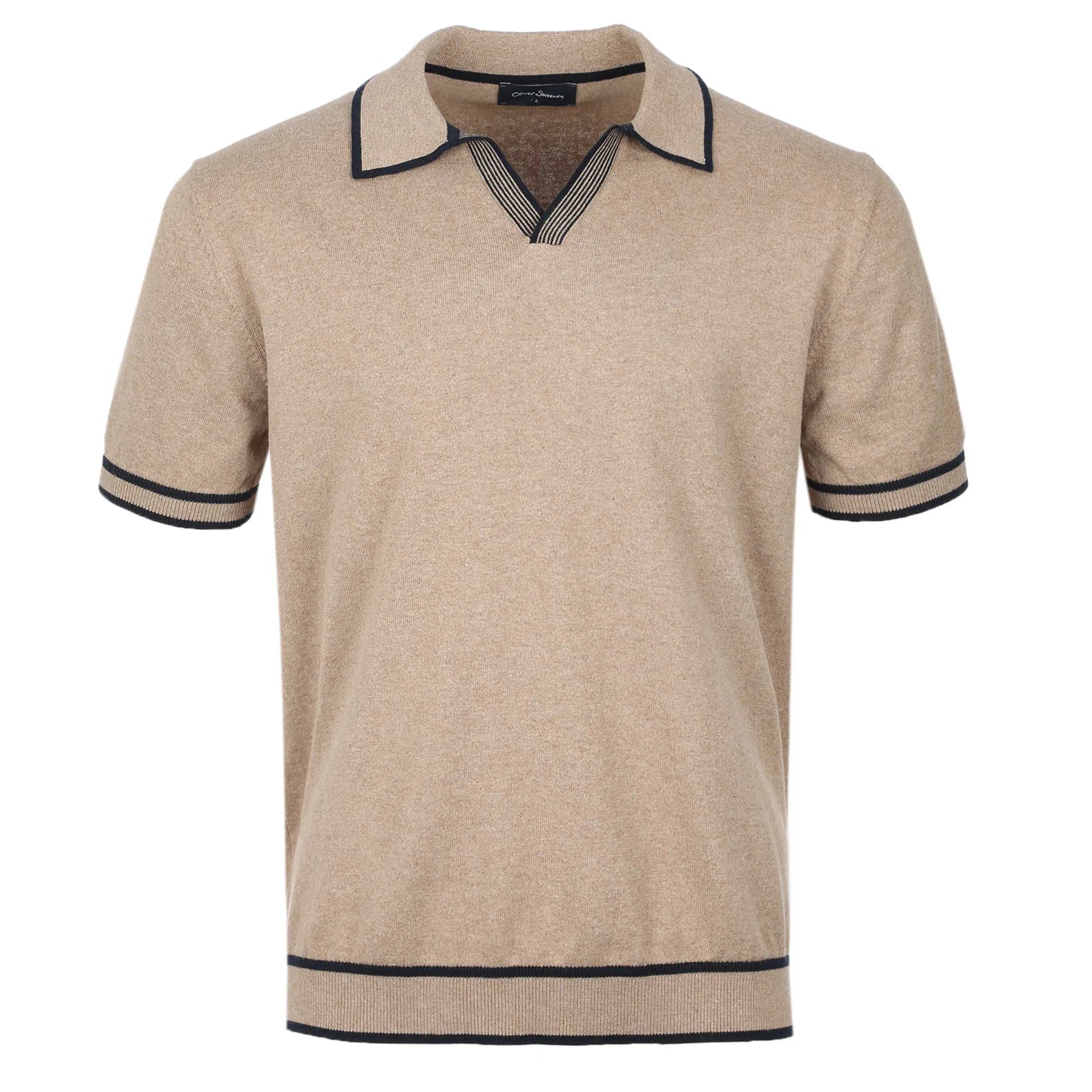 Oliver Sweeney Garras Knit Polo Shirt in Camel. This 100% cotton knitted polo is built for comfort and style. Open collar with a contrasting stripe placket. It features an Oliver Sweeney logo tab to the waist. Contrasting trim to the collar, cuffs and waistband. Other features include ribbed cuffs and waistband.