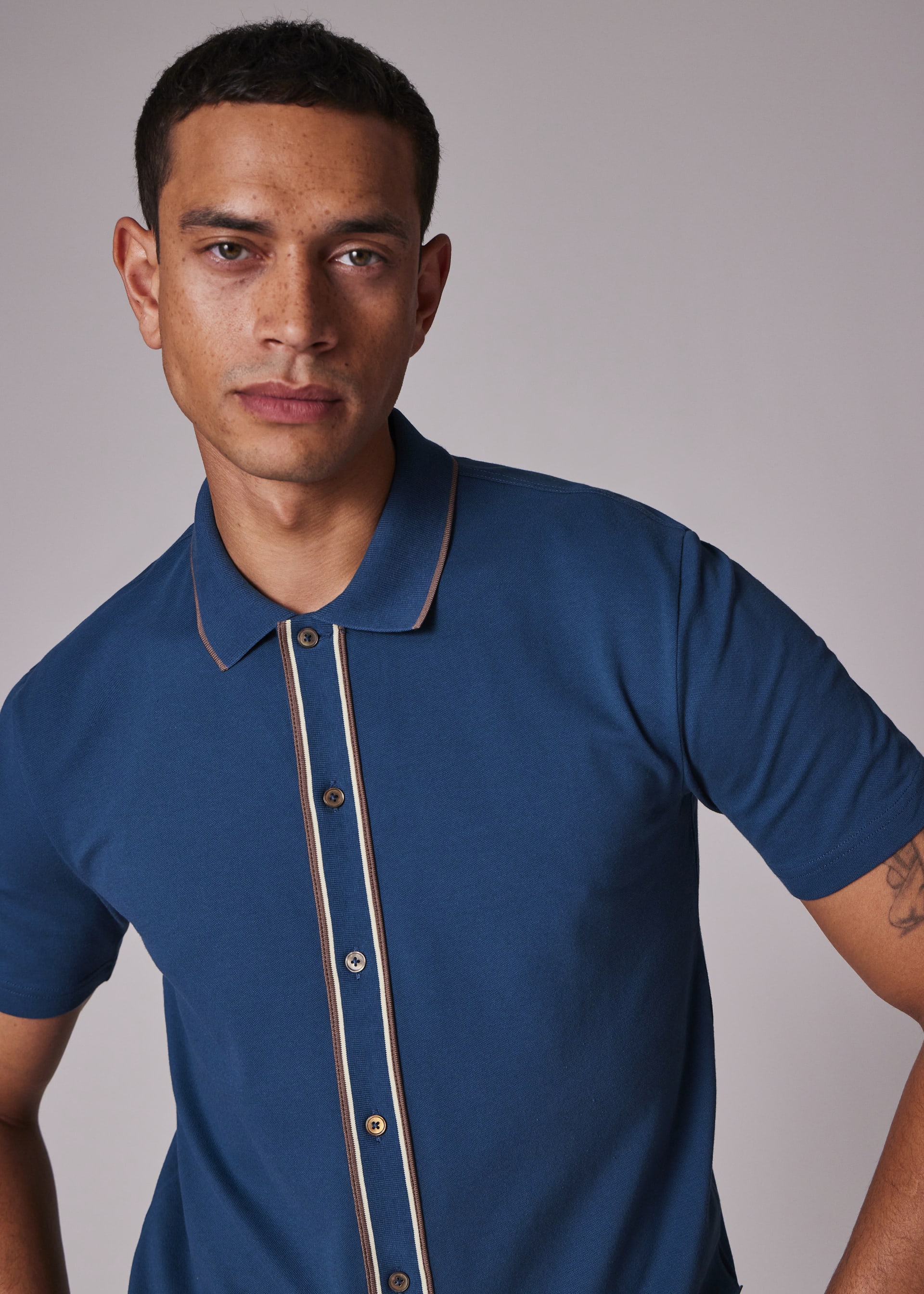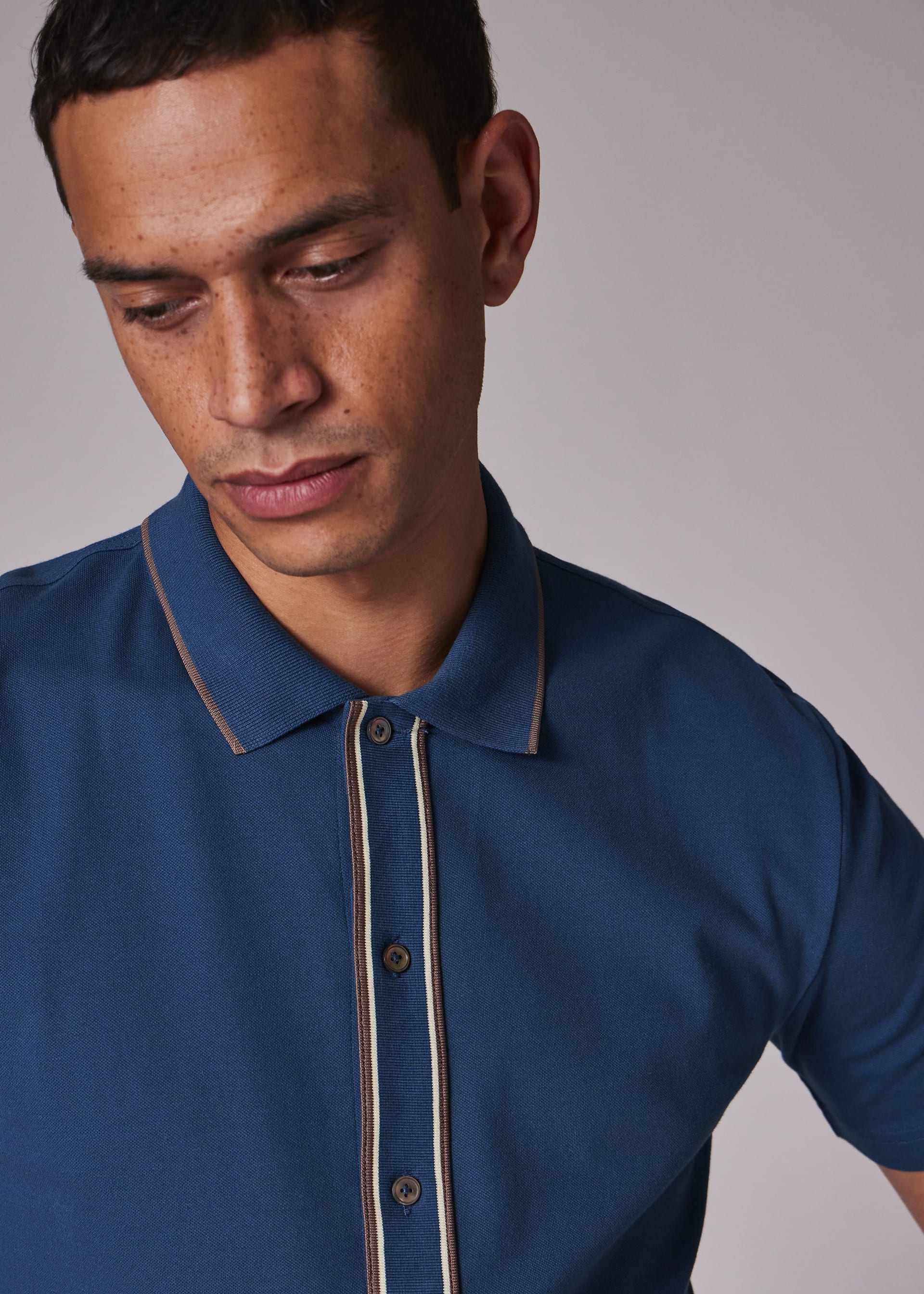 Made from organic cotton pique with stretch for added comfort, this teal polo shirt features a full button placket. Finished with brown tipping on the placket and collar.