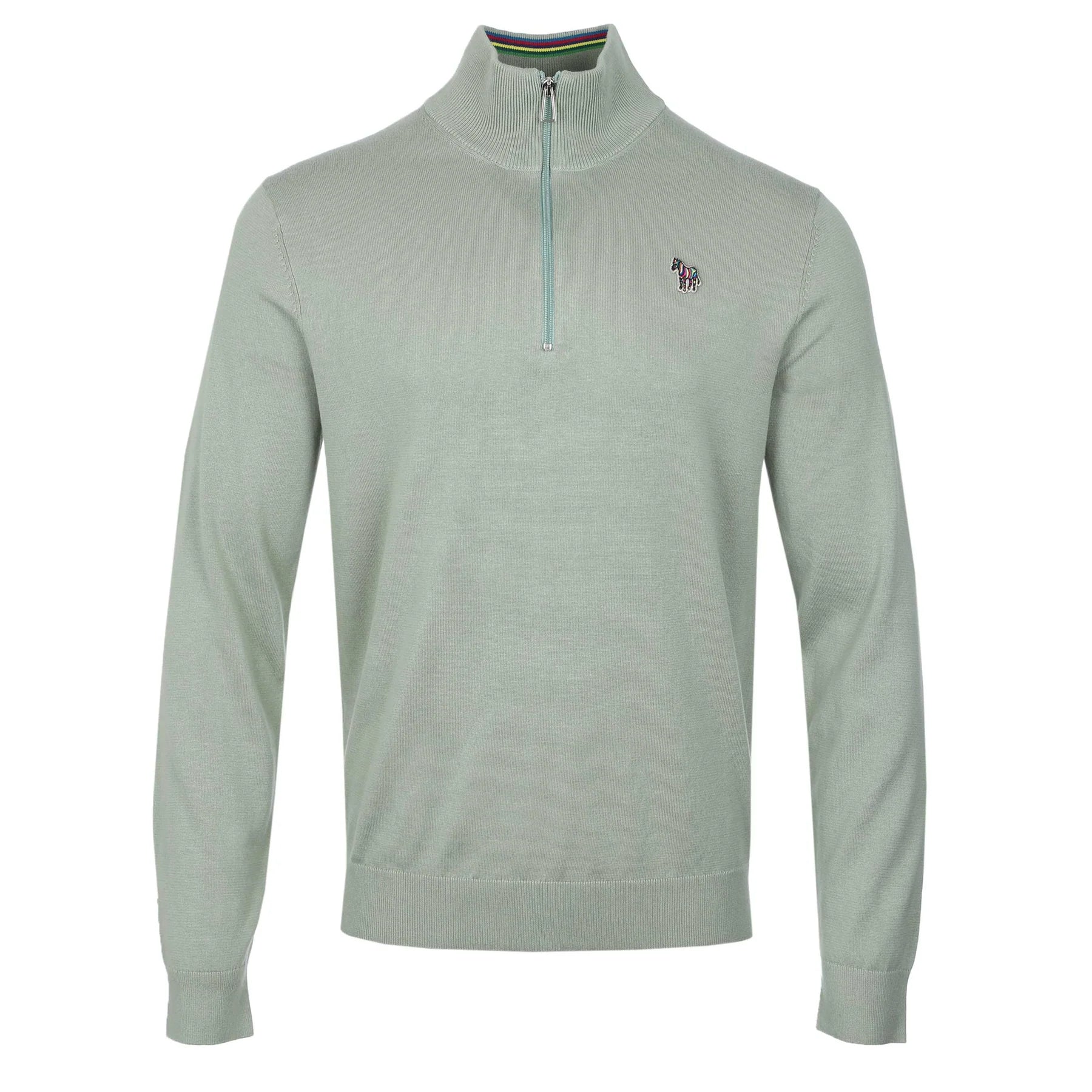 Paul Smith Zip Zebra Badge Knitwear in Pastel Green. A classic knitwear by Paul Smith. Featuring long sleeves, a funnel neck and a half zip fastening placket. Contrasting colour zebra logo badger. Finished with a ribbed waistband and cuffs. Perfect for everyday wear.