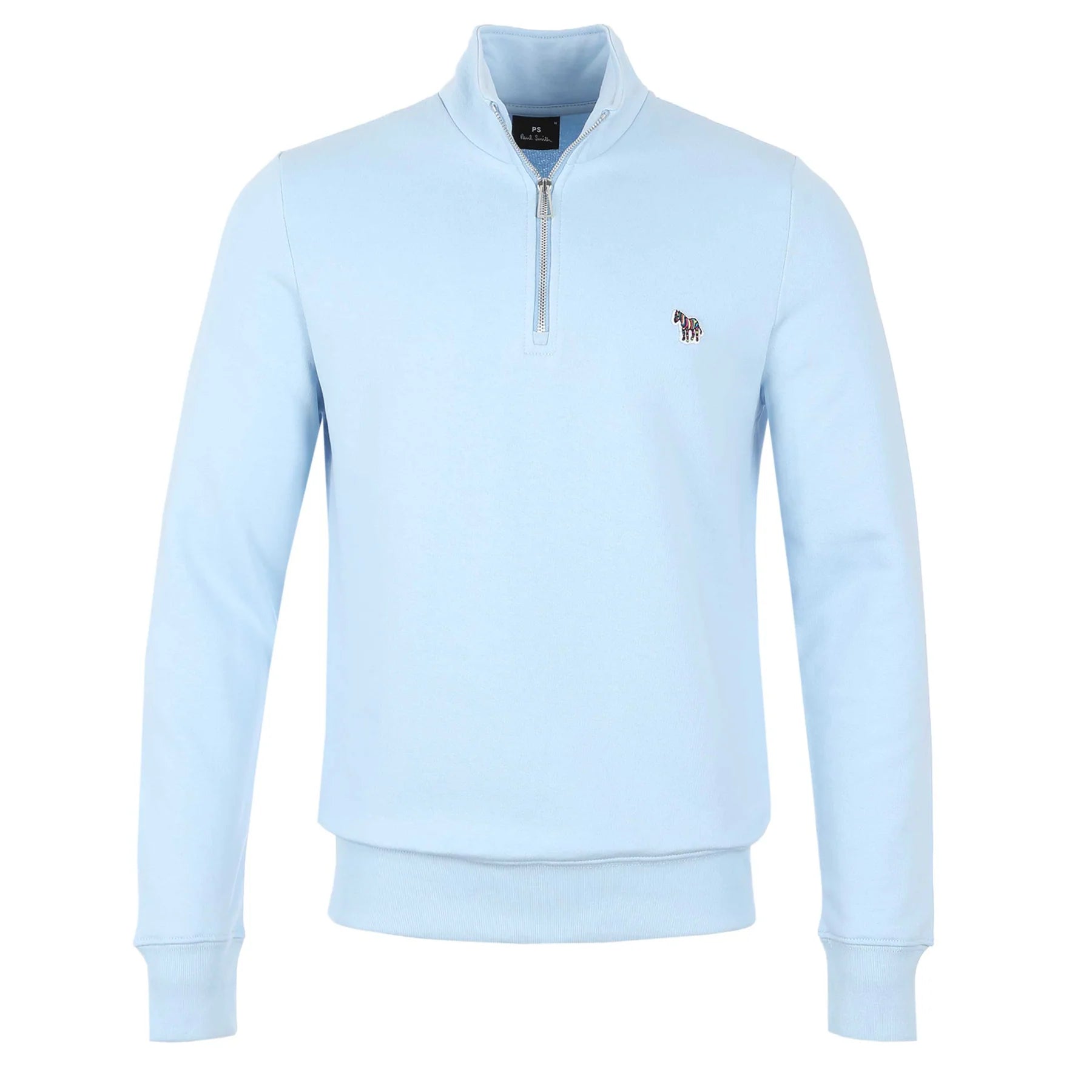 Paul Smith Half Zip Sweat Top in Sky Blue. A sweat top by Paul Smith. Featuring long sleeves, a funnel neck and half zip fastening. Zebra logo badge to the chest. Finished with a ribbed waistband and cuffs. Perfect for everyday wear.