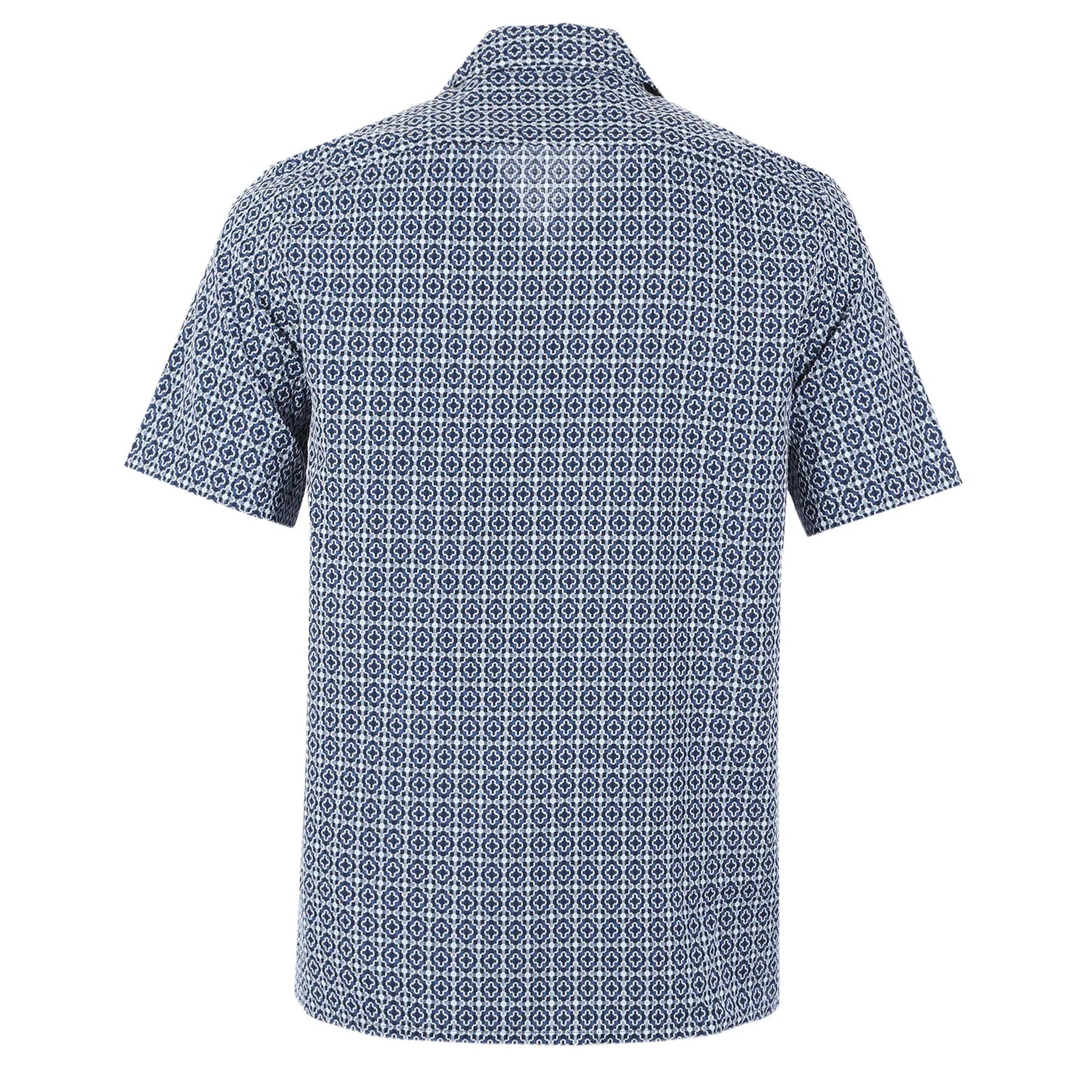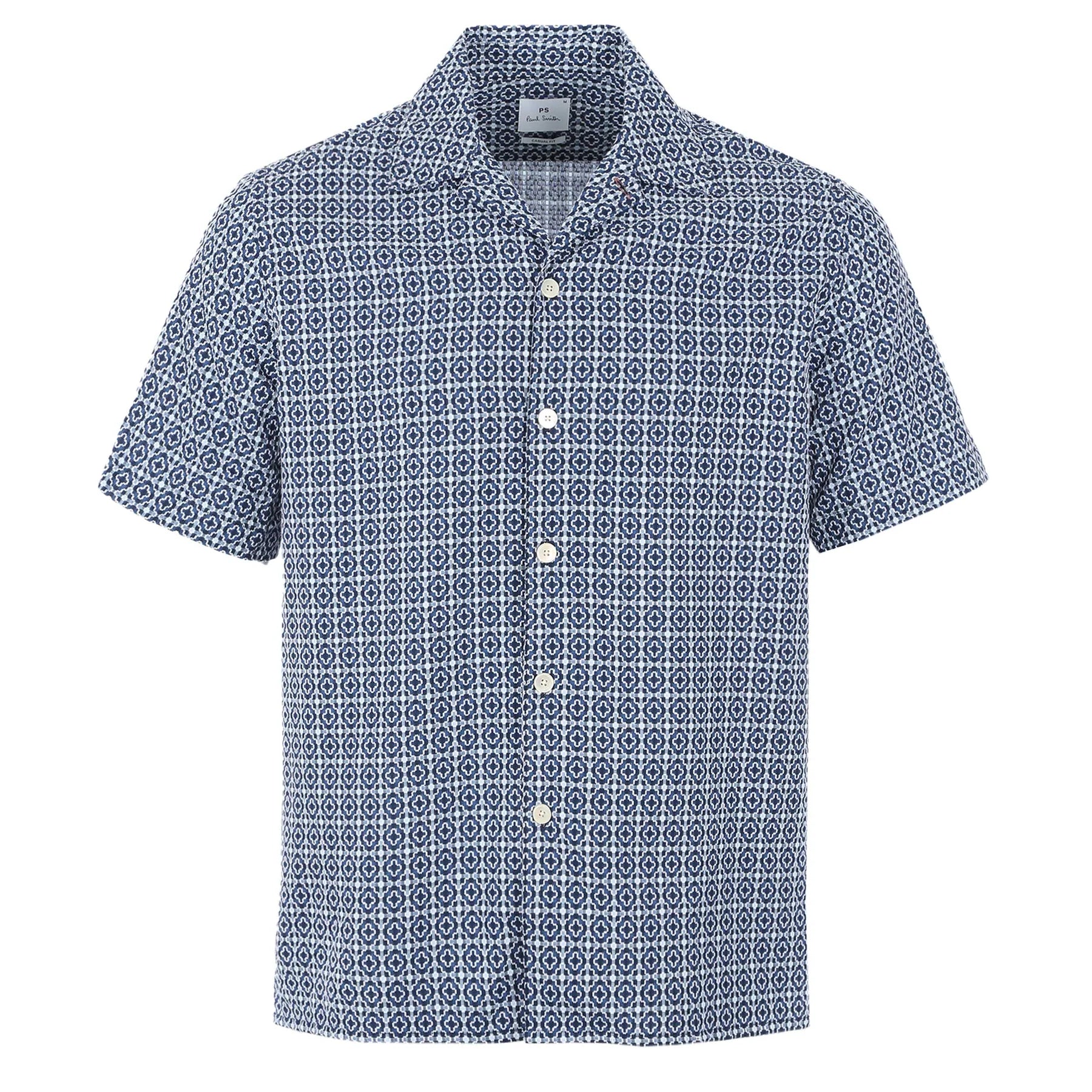 Paul Smith Geometric Casual Fit SS Shirt in Navy. A casual fit shirt with a full button fastening placket. Cuban collar shirt with short sleeves. All over geometric print design to the shirt. Paul Smith tab logo on waist of garment