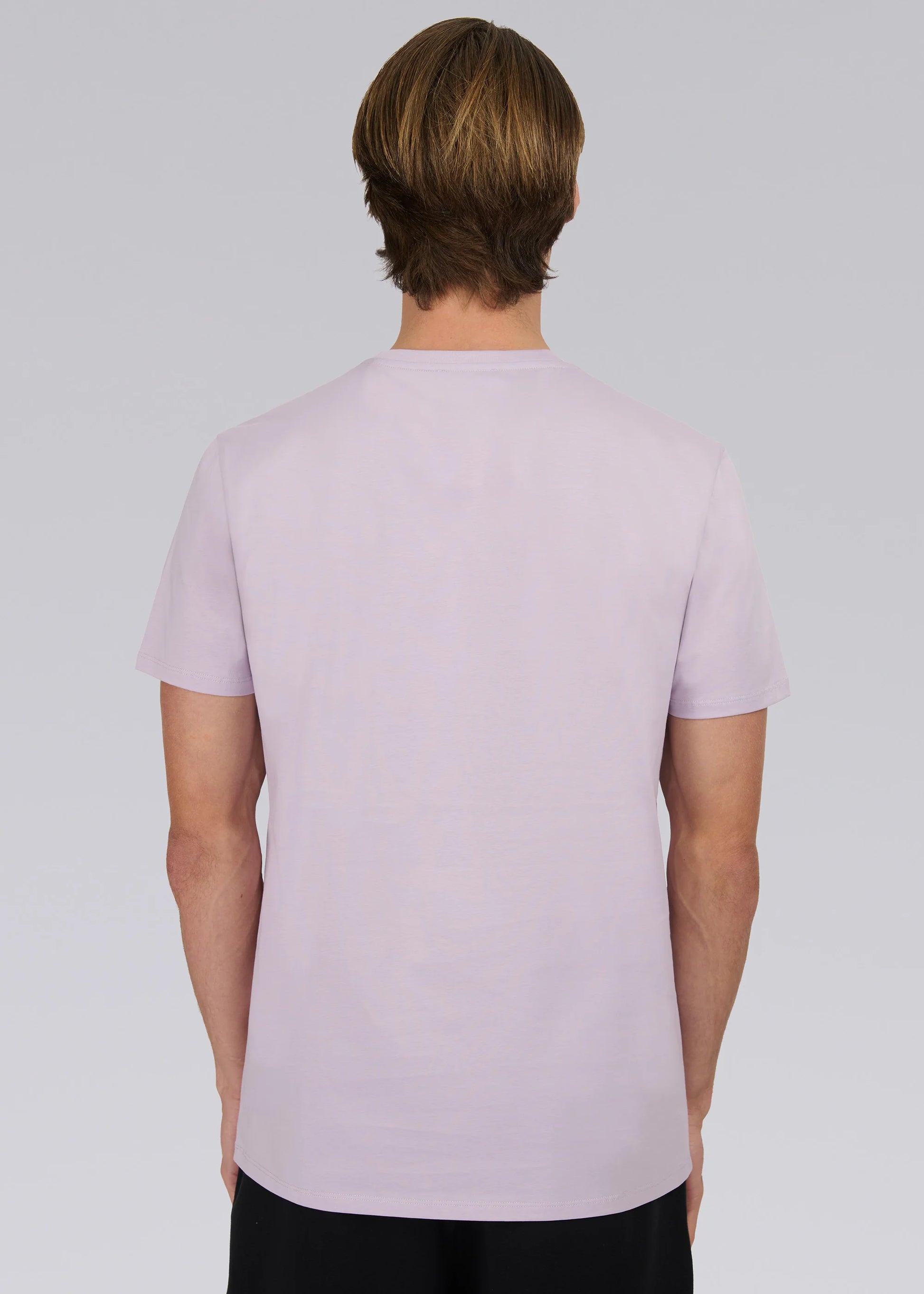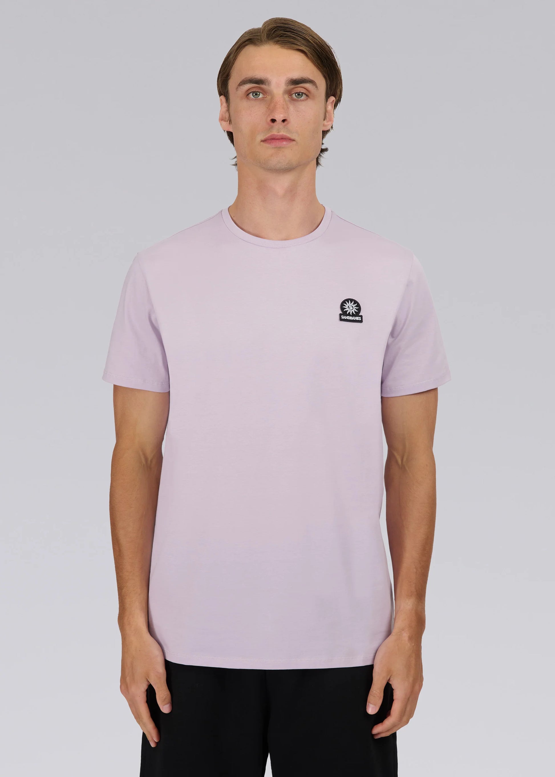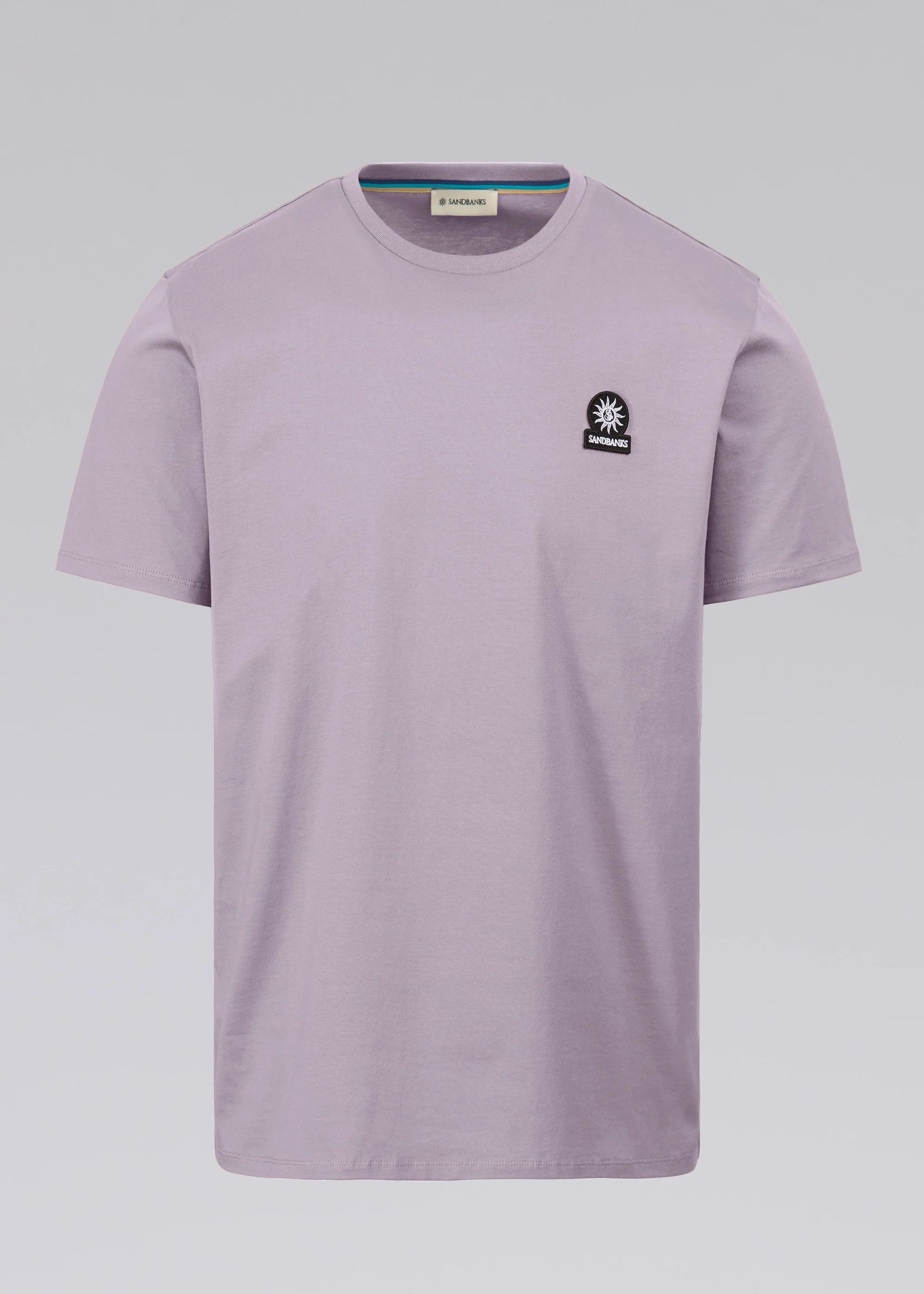 Sandbanks men's badge logo t-shirt in lilac, made from mercerised cotton for a silky and luxurious feel. This classic fitting crew neck t-shirt features an embroidered badge logo on the chest and tri-colour back neck binding.