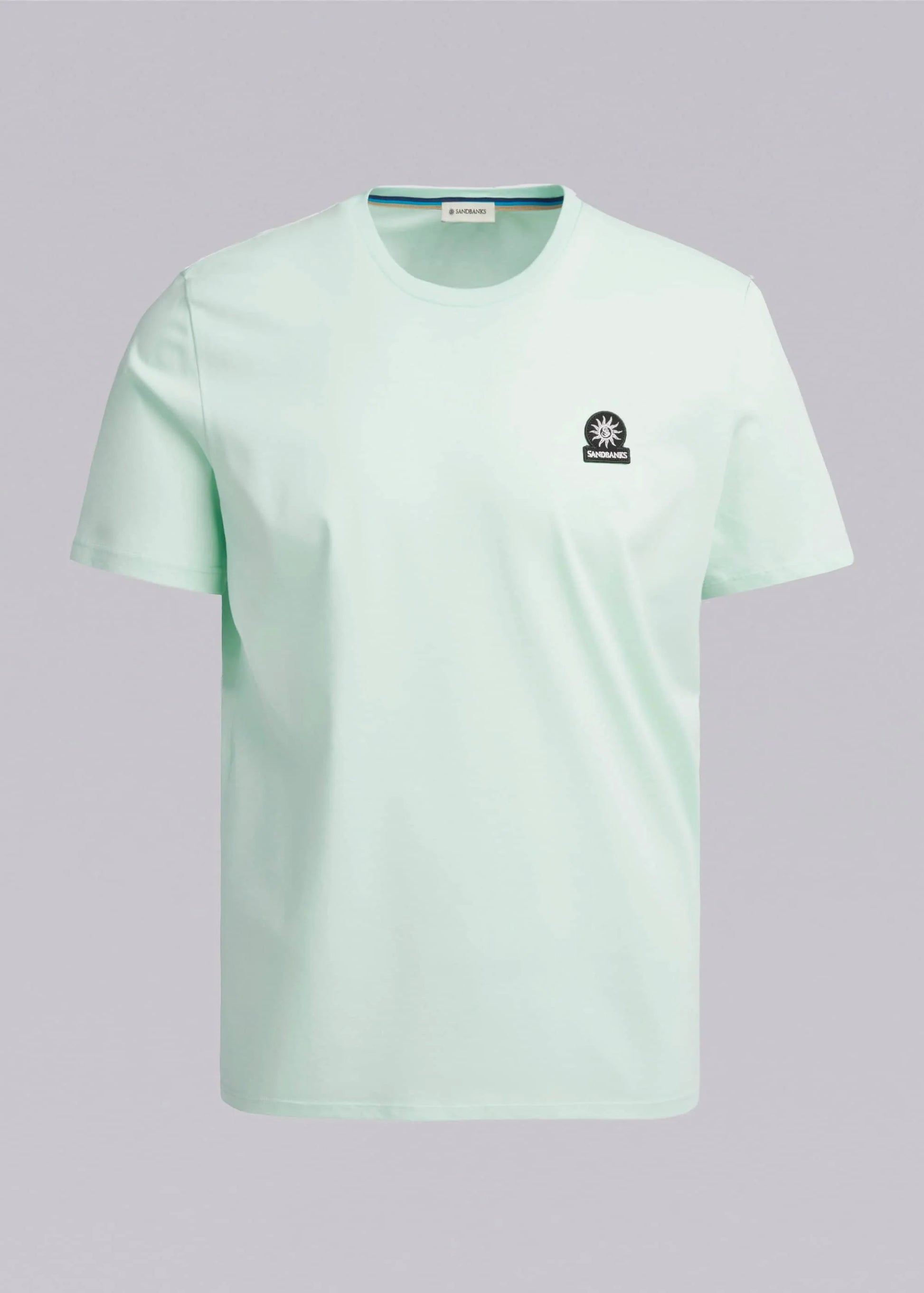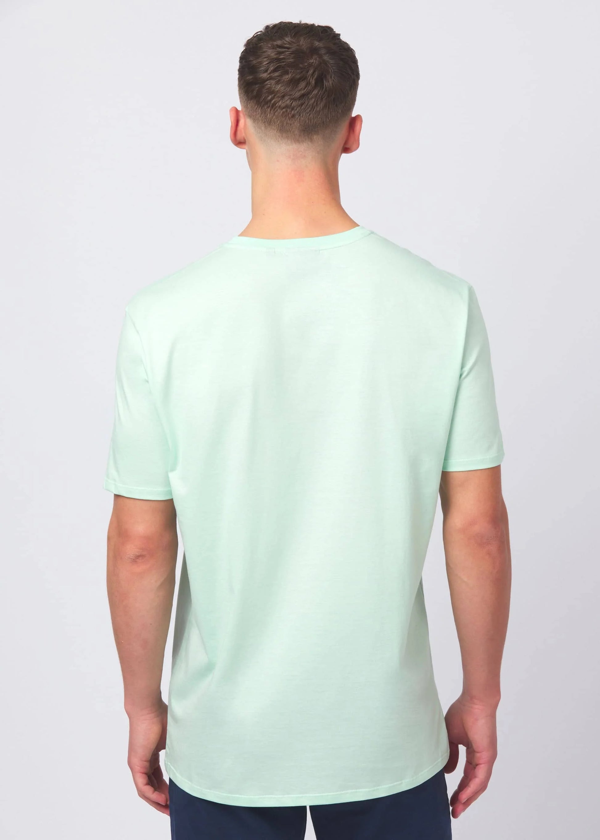 Sandbanks men's badge logo t-shirt in mint, made from mercerised cotton for a silky and luxurious feel. This classic fitting crew neck t-shirt features an embroidered badge logo on the chest and tri-colour back neck binding.