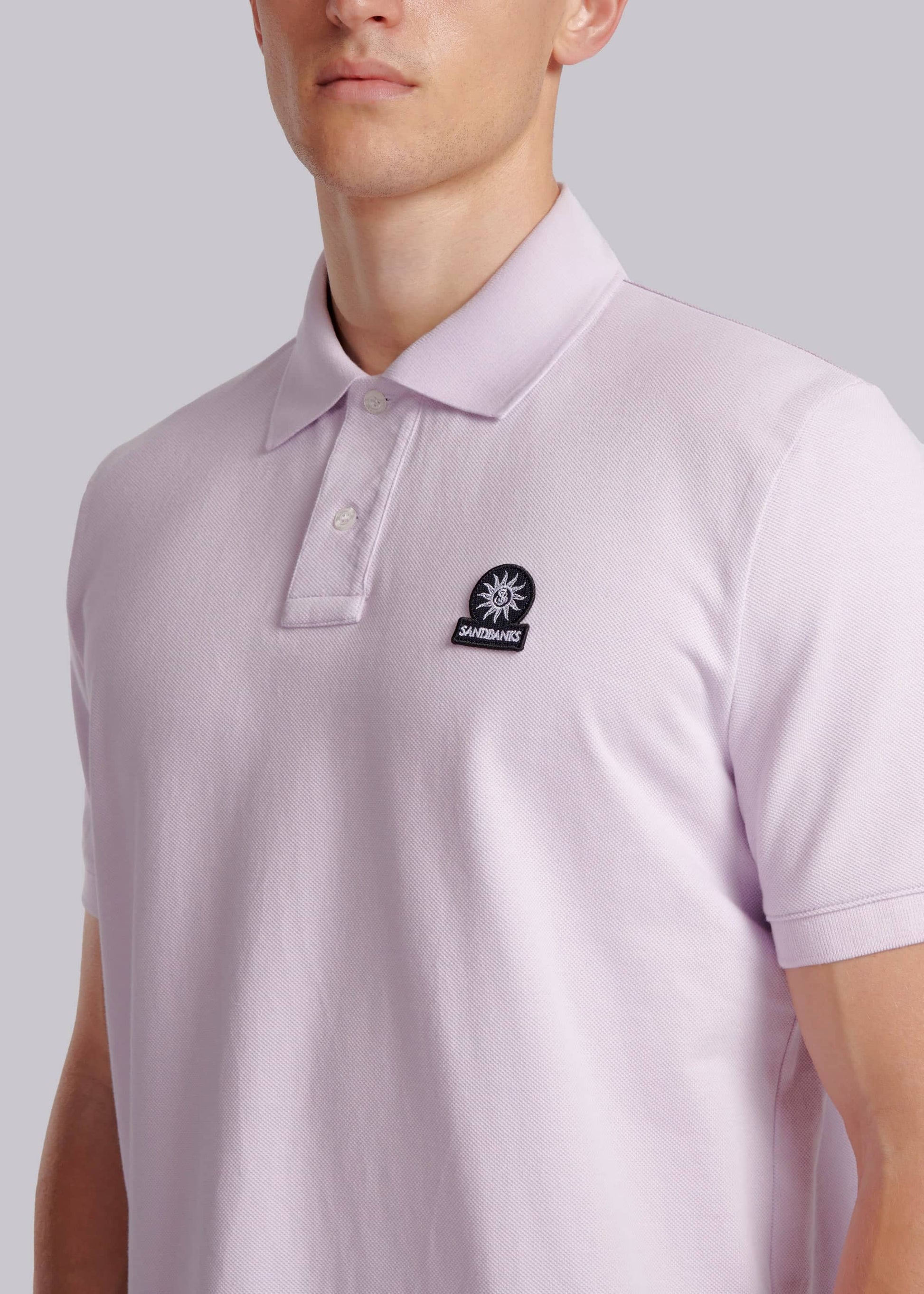 Sandbanks men's badge logo polo shirt in lilac, made from 100% mercerised organic cotton. This classic fitting 2 button polo shirt features an embroidered badge logo on the chest, ribbed collar and cuff, and tri-colour back neck binding.