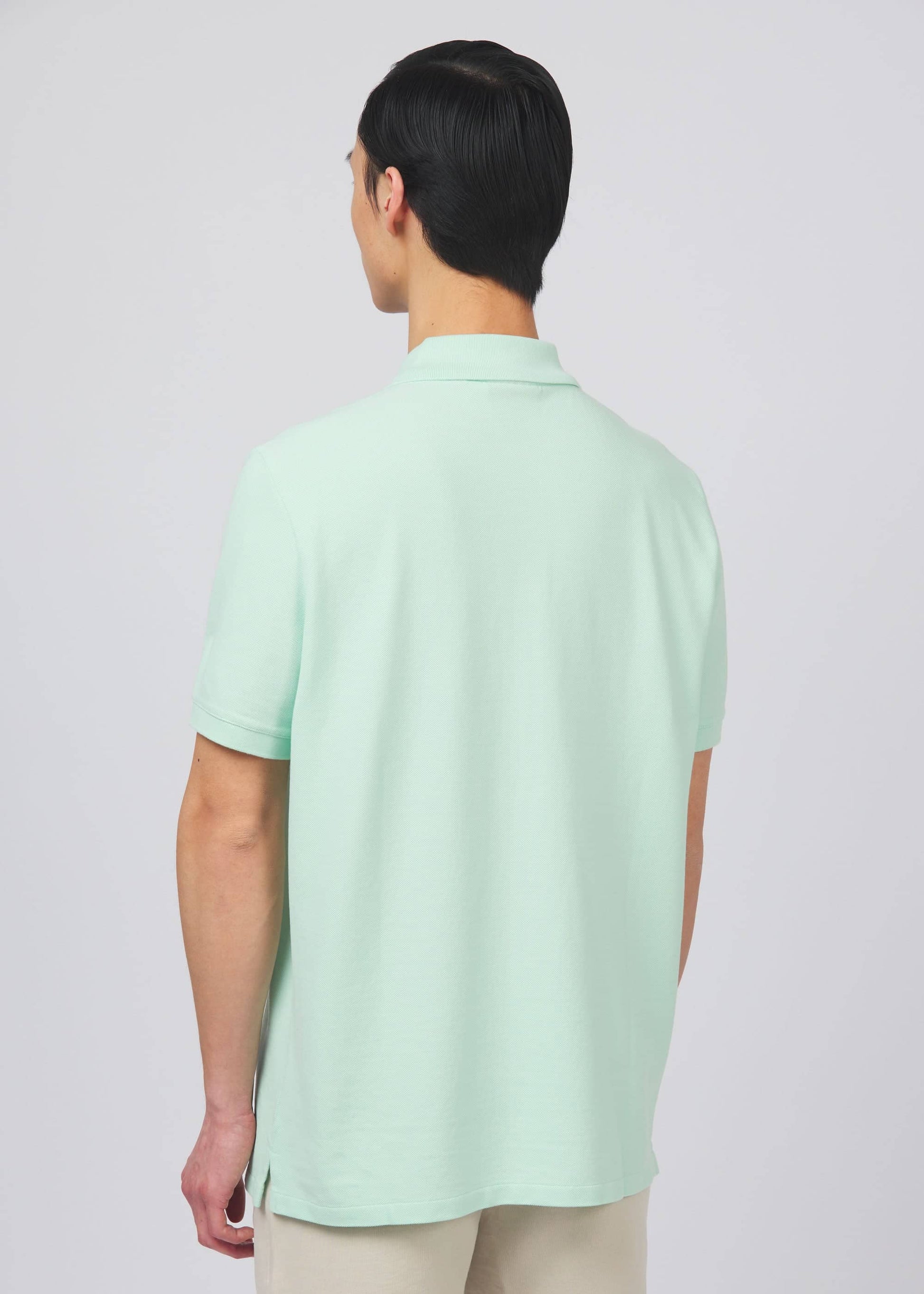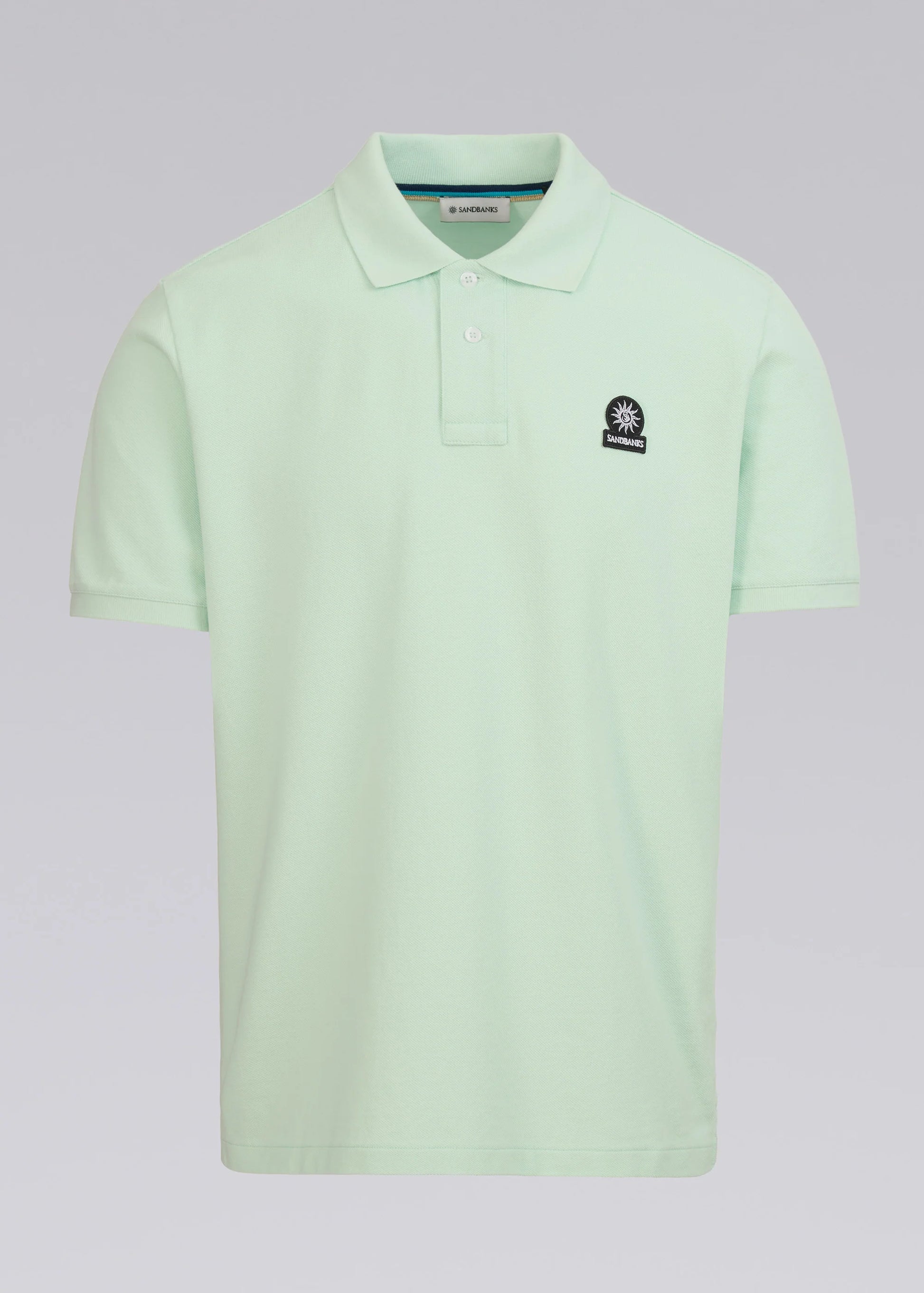 Sandbanks men's badge logo polo shirt in mint, made from 100% mercerised organic cotton. This classic fitting 2 button polo shirt features an embroidered badge logo on the chest, ribbed collar and cuff, and tri-colour back neck binding.