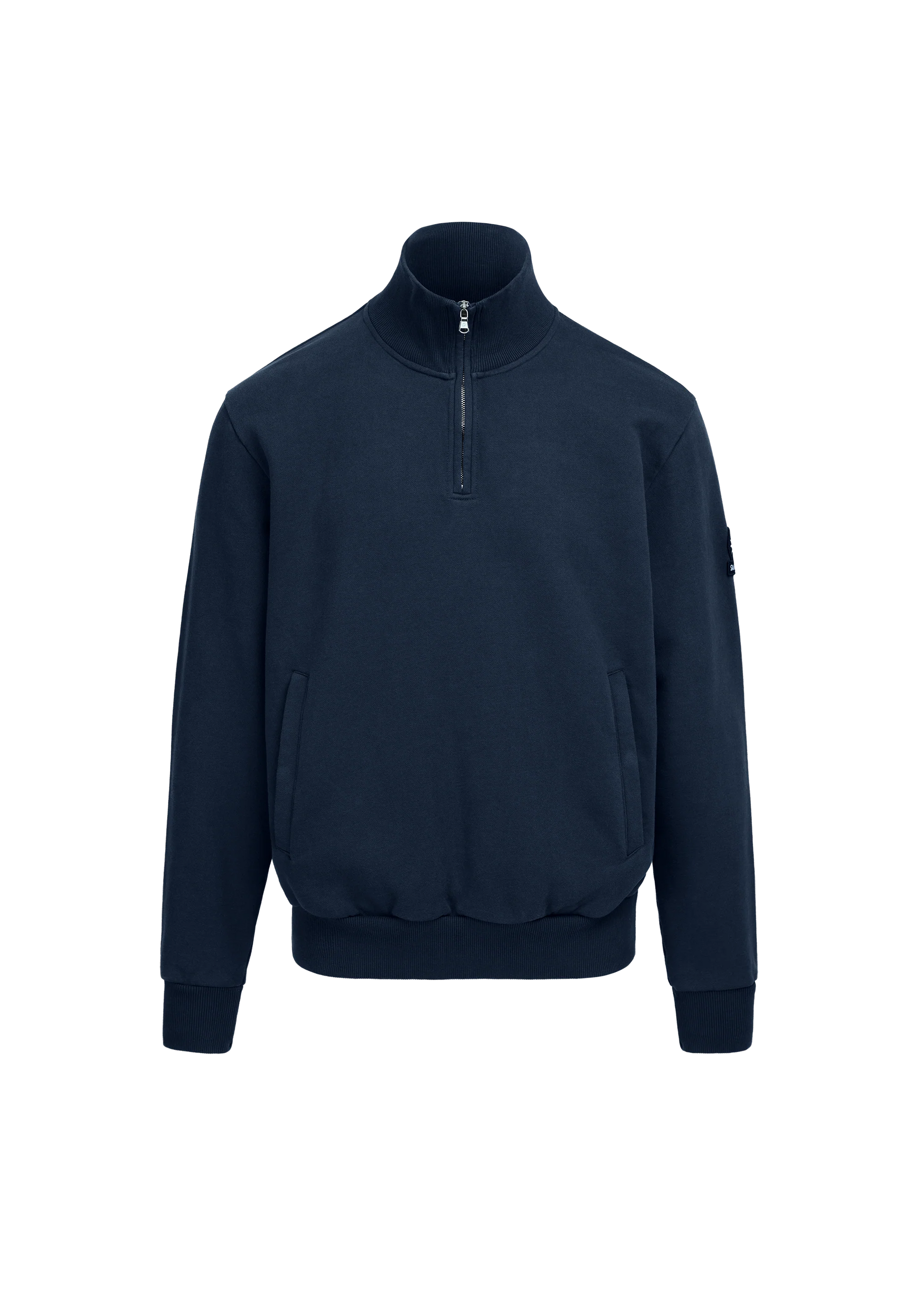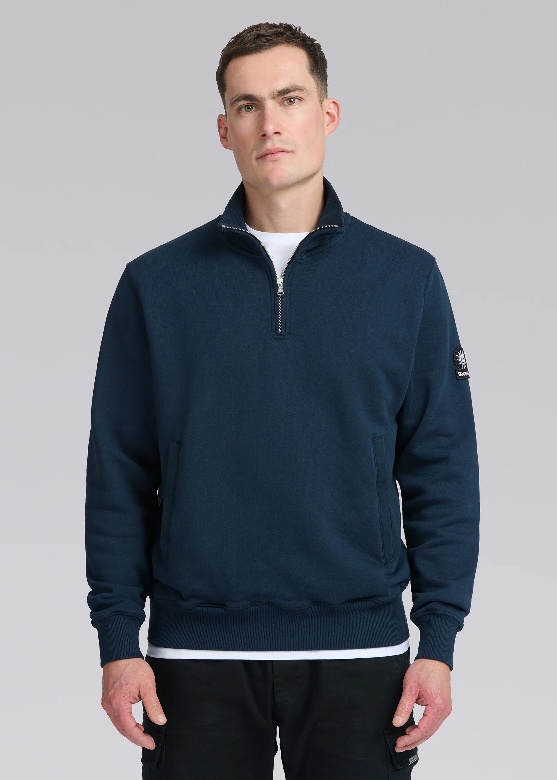 Sandbanks badge logo quarter zip sweatshirt in navy, made from a 400gsm diagonal knitted 100% BCI cotton fabric that features a slight brushed back for a superior soft feeling and warmth, whilst remaining breathable. This quarter zip sweatshirt features a Lampo metal zip in silver with a ribbed neck.