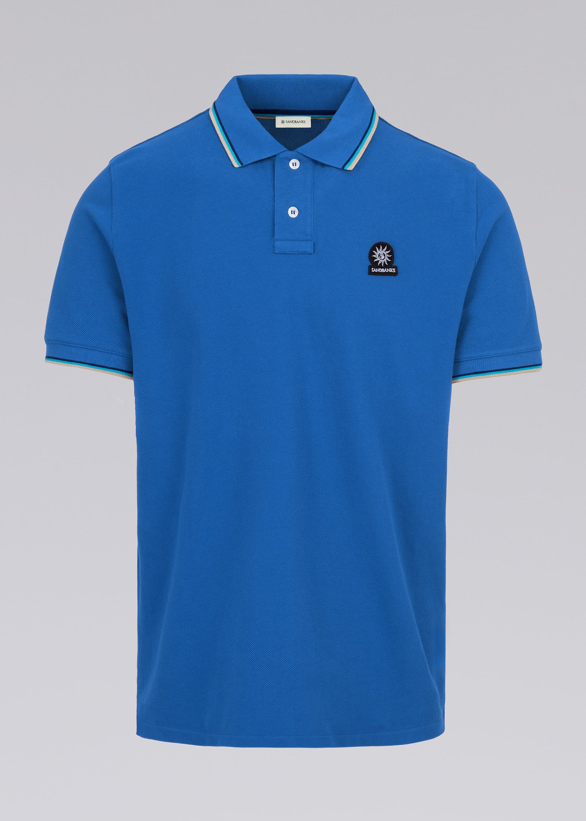 Sandbanks men's badge logo polo shirt in nautical blue, made from 100% organic cotton. This classic fitting 2 button polo shirt features an embroidered badge logo on the chest, tri-colour tipped ribbed collar, cuff and back neck binding.