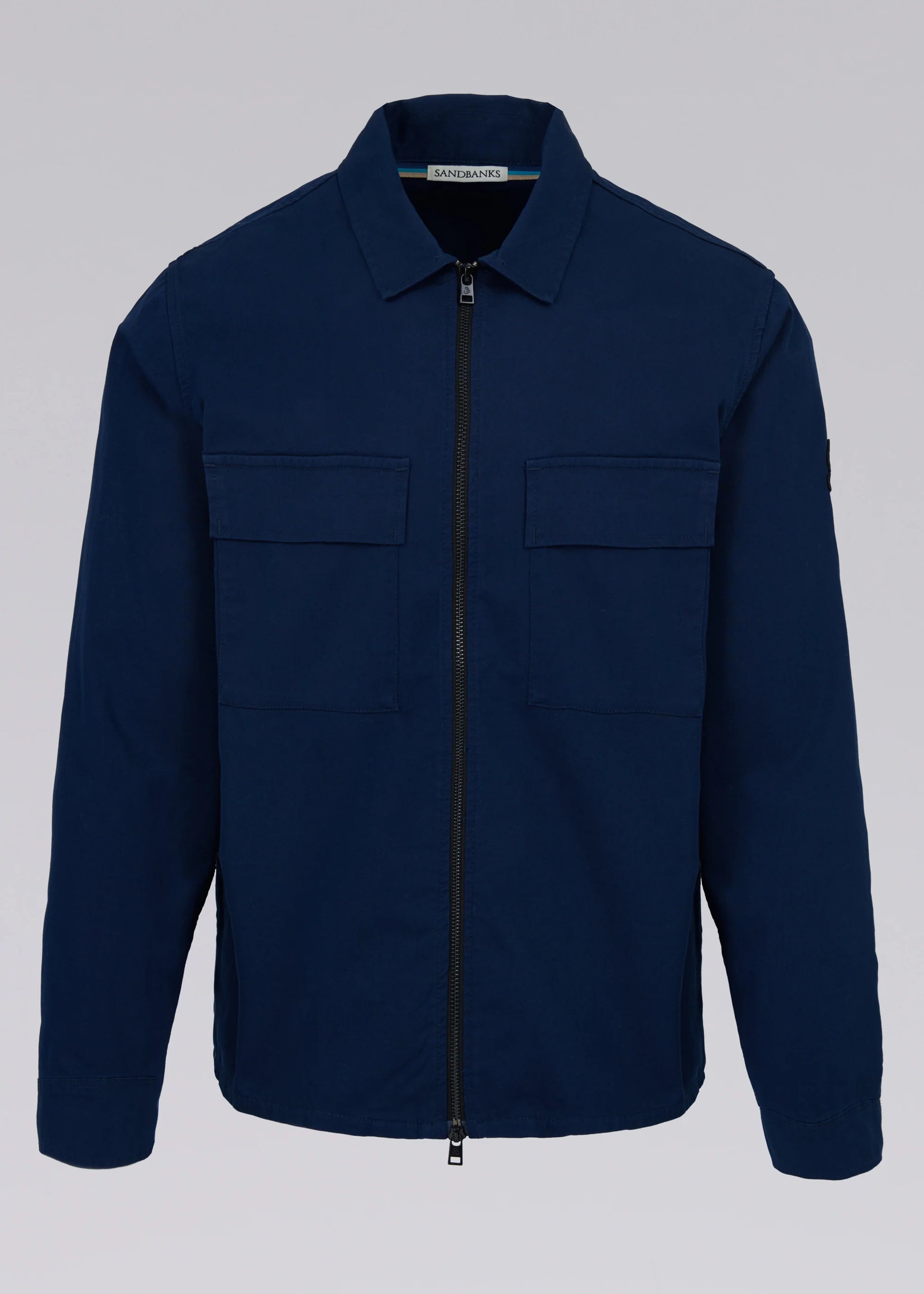 Sandbanks men's Gabardine Zip Overshirt in navy, made from a organic cotton stretch gabardine with a soft and luxurious handle. This overshirt features a Sandbanks logo badge embroidery on the sleeve, metal YKK zip in black with enamel branded pullers, tri-colour neck binding, chest pockets, side entry pockets and black rubberised buttons on the cuffs.