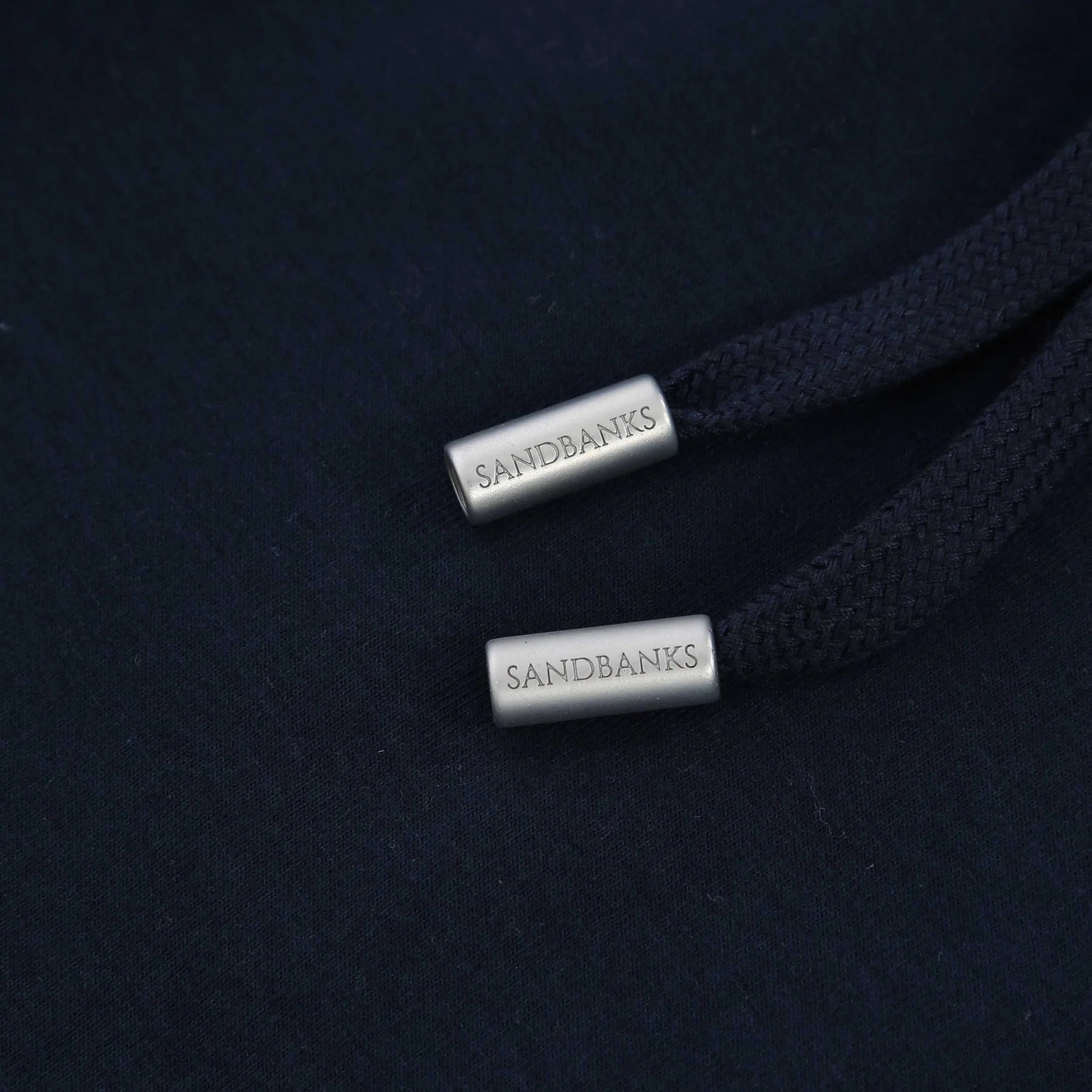 Sandbanks Interlock Shorts in Navy. Shorts by Sandbanks. A plain design short constructed from an interlock cotton. Elasticated waistband with drawstrings. Metal toggles to the drawstring with laser engraved Sandbanks logo. 2 side pockets and a seat pocket. Sandbanks logo badge to the left leg.