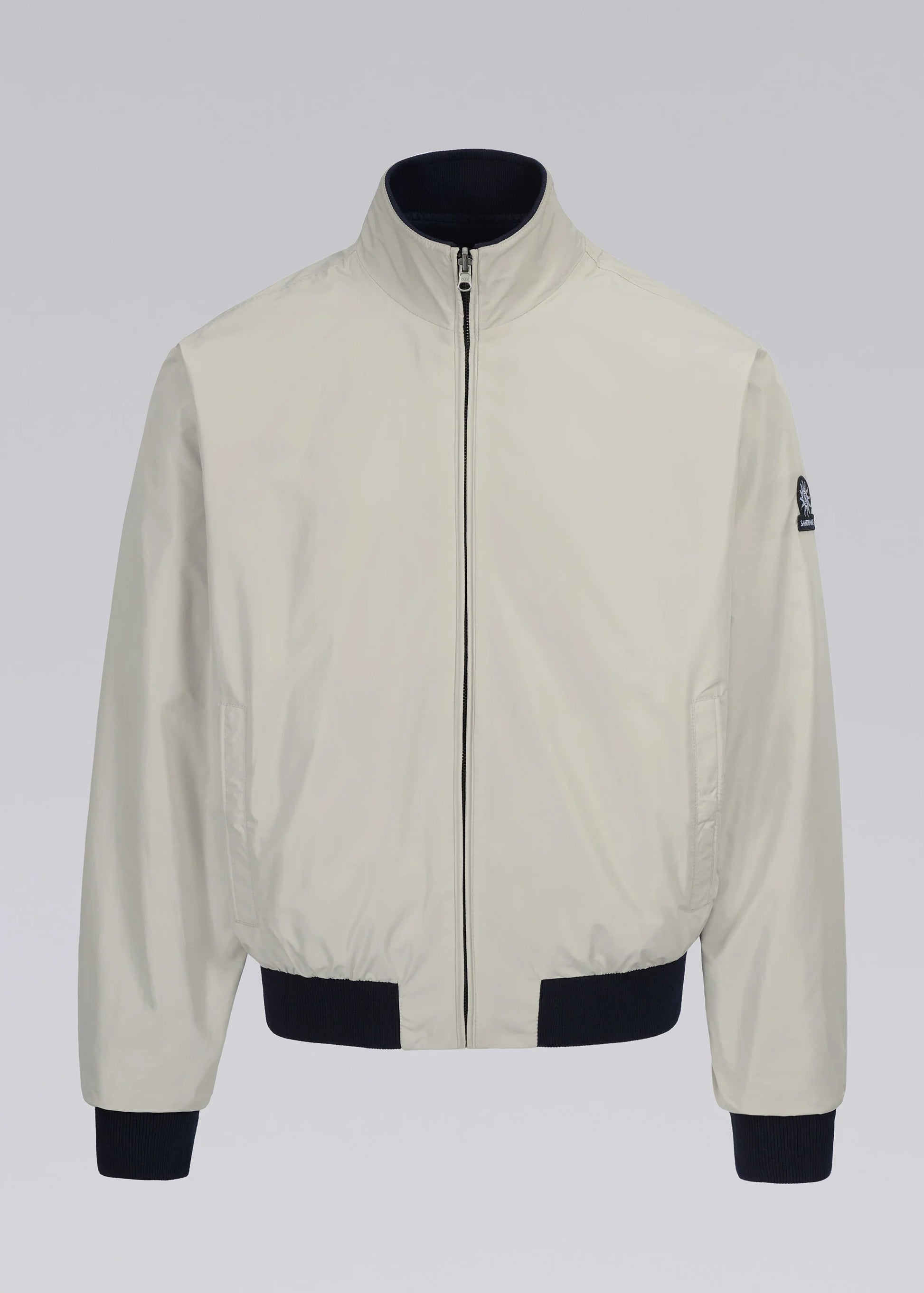 Sandbanks reversible funnel neck bomber jacket, a light weight shell jacket ideal for those summer evenings made from Italian recycled polyester fabrics. One side in navy features side zip pockets and the other side in stone with button close pockets, both featuring embroidered Sandbanks badges.