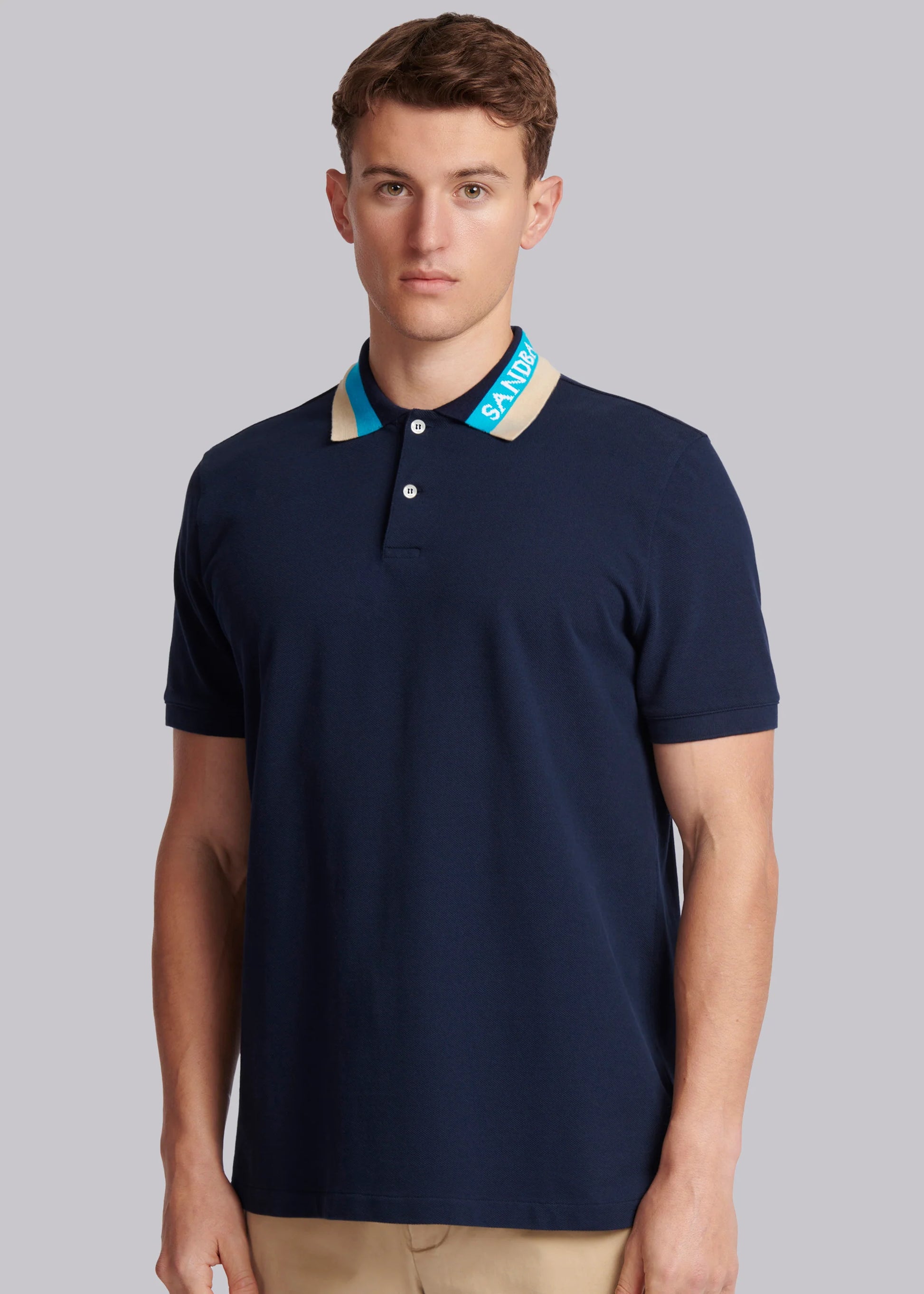 Sandbanks men's tri-colour collar polo shirt in Navy, made from 100% organic cotton. This classic fitting polo shirt features statement tri-colour jacquard collar with contrast Sandbanks logo, tri-colour back neck binding and classic two button placket with engraved buttons.
